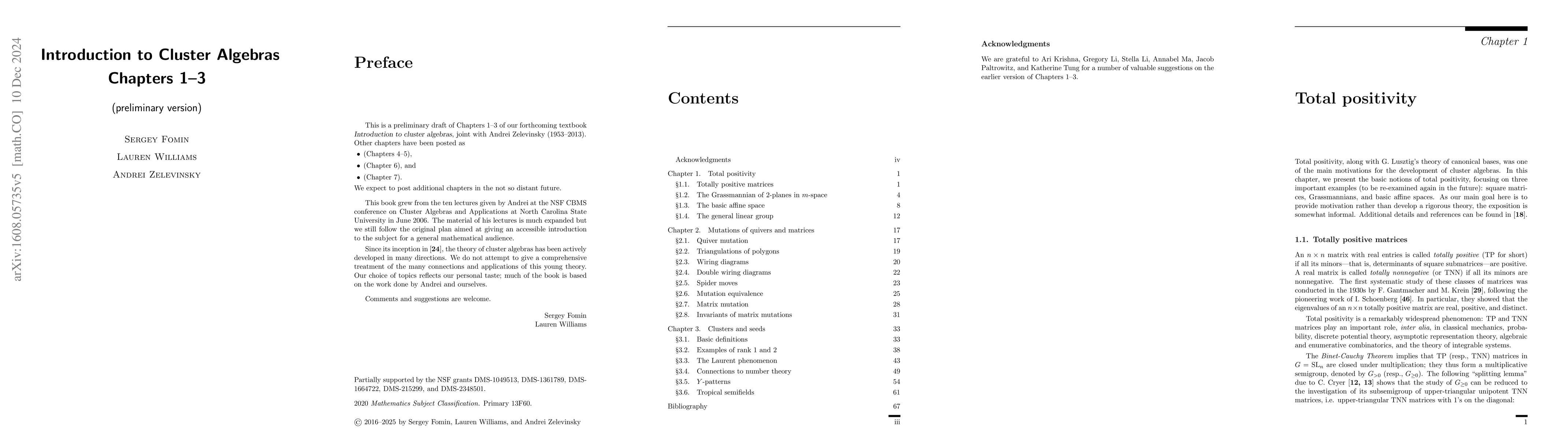 This is a preliminary draft of Chapters 1-3 of our forthcoming textbook "Introduction to Cluster Algebras." This installment contains: Chapter 1. Total positivity Chapter 2. Mutations of quivers and matrices Chapter 3. Clusters and seeds