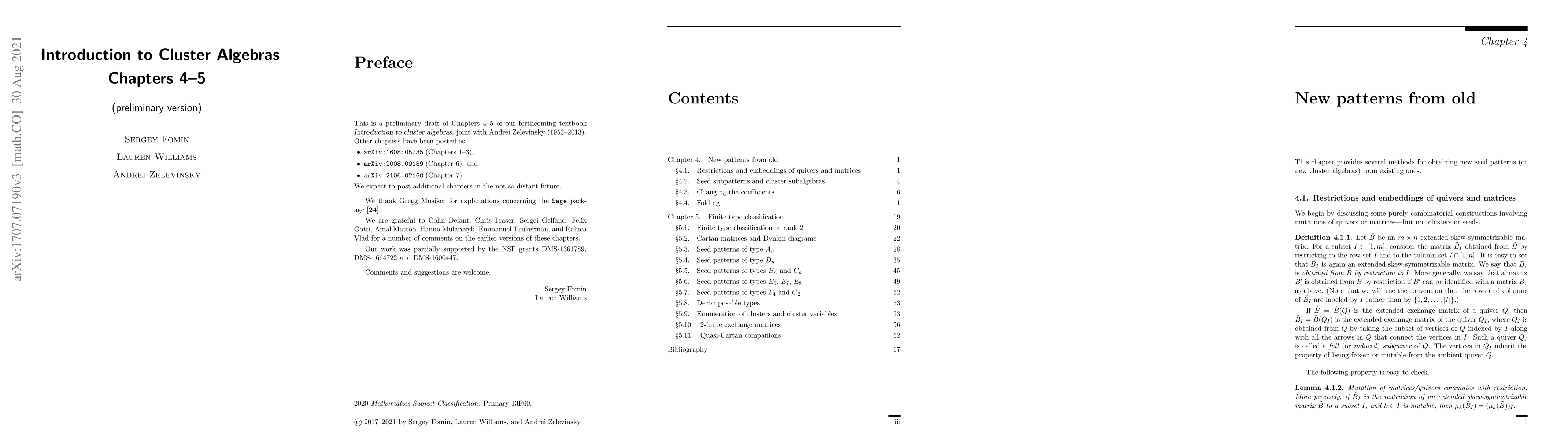 This preliminary draft introduces new patterns derived from existing cluster algebras and explores the finite type classification of these structures, building on the foundational material presented in earlier chapters.