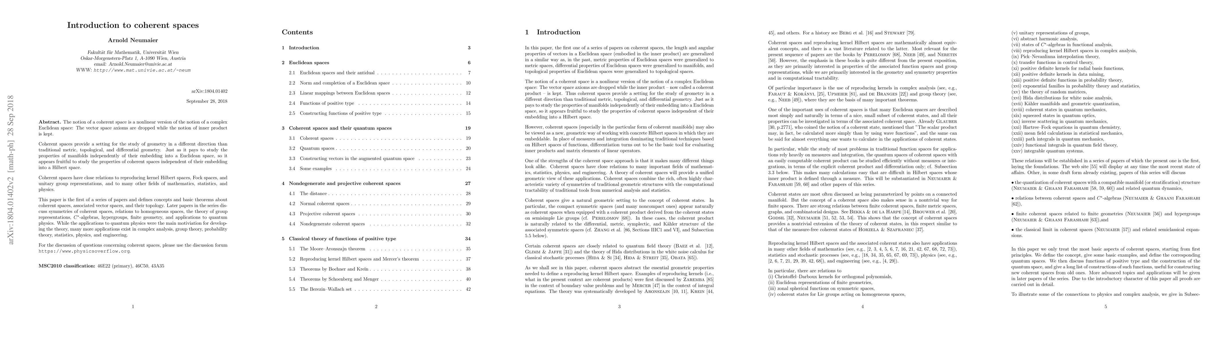 The notion of a coherent space is a nonlinear version of the notion of a complex Euclidean space: The vector space axioms are dropped while the notion of inner product is kept. Coherent spaces provide a setting for the study of geometry in a different direction than traditional metric, topological, and differential geometry. Just as it pays to study the properties of manifolds independently of their embedding into a Euclidean space, so it appears fruitful to study the properties of coherent spaces independent of their embedding into a Hilbert space. Coherent spaces have close relations to reproducing kernel Hilbert spaces, Fock spaces, and unitary group representations, and to many other fields of mathematics, statistics, and physics. This paper is the first of a series of papers and defines concepts and basic theorems about coherent spaces, associated vector spaces, and their topology. Later papers in the series discuss symmetries of coherent spaces, relations to homogeneous spaces, the theory of group representations, $C^*$-algebras, hypergroups, finite geometry, and applications to quantum physics. While the applications to quantum physics were the main motiviation for developing the theory, many more applications exist in complex analysis, group theory, probability theory, statistics, physics, and engineering.