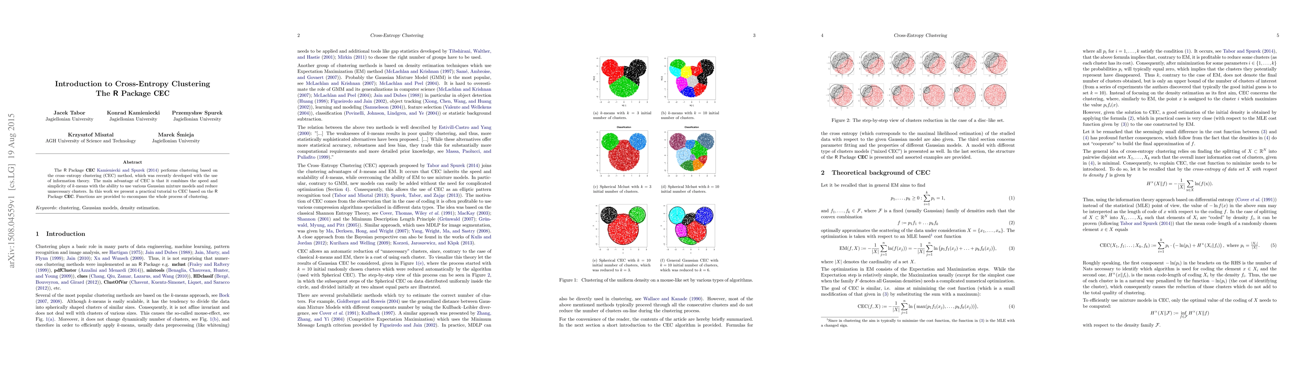 The R Package CEC performs clustering based on the cross-entropy clustering (CEC) method, which was recently developed with the use of information theory. The main advantage of CEC is that it combines the speed and simplicity of $k$-means with the ability to use various Gaussian mixture models and reduce unnecessary clusters. In this work we present a practical tutorial to CEC based on the R Package CEC. Functions are provided to encompass the whole process of clustering.
