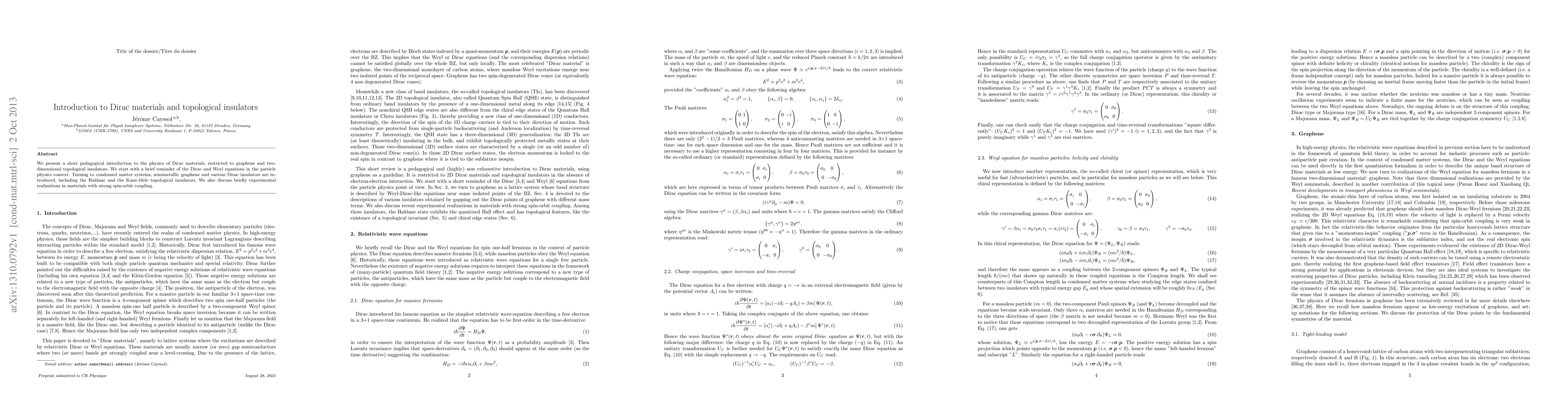 This paper offers a concise introduction to Dirac materials and topological insulators, focusing on graphene and two-dimensional systems, while briefly reviewing Dirac and Weyl equations and touching on experimental realizations.