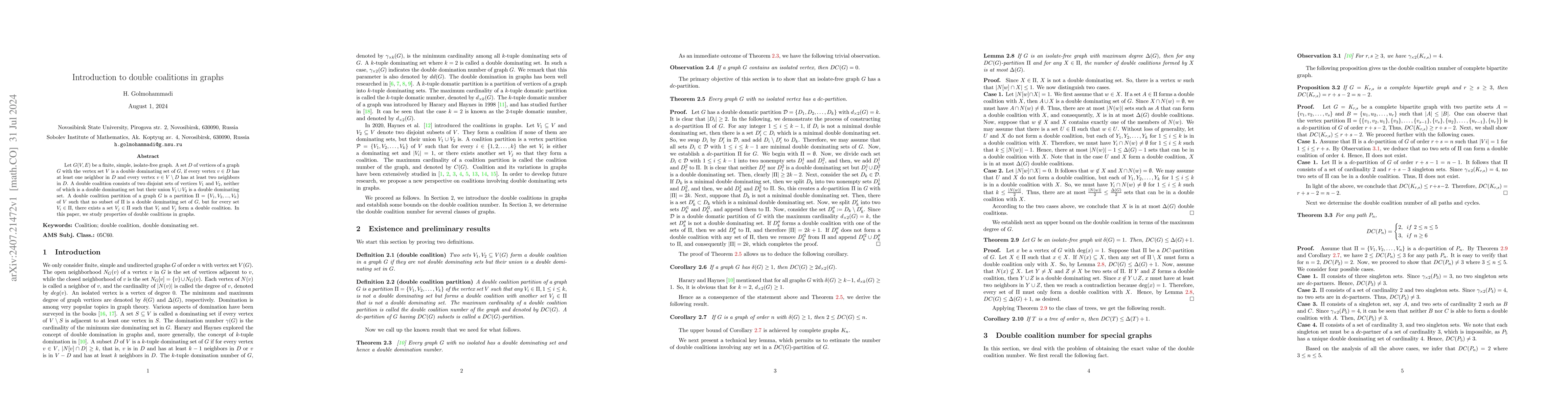 Let $G(V, E)$ be a finite, simple, isolate-free graph. A set $D$ of vertices of a graph $G$ with the vertex set $V$ is a double dominating set of $G$, if every vertex $v\in D$ has at least one neighbor in $D$ and every vertex $v \in V \setminus D$ has at least two neighbors in $D$. A double coalition consists of two disjoint sets of vertices $V_{1}$ and $V_{2}$, neither of which is a double dominating set but their union $V_{1}\cup V_{2}$ is a double dominating set. A double coalition partition of a graph $G$ is a partition $\Pi = \{V_1, V_2,..., V_k \}$ of $V$ such that no subset of $\Pi$ is a double dominating set of $G$, but for every set $V_i \in \Pi$, there exists a set $V_j \in \Pi$ such that $V_i$ and $V_j$ form a double coalition. In this paper, we study properties of double coalitions in graphs.