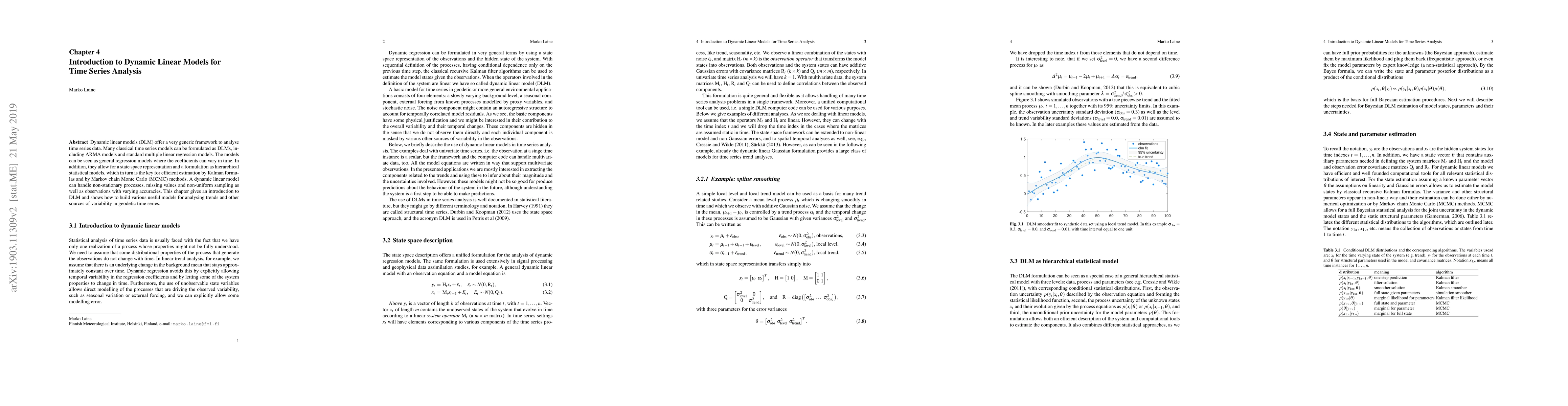 Dynamic linear models (DLM) provide a versatile framework for time series analysis, encompassing classical models like ARMA and multiple linear regression, and enabling efficient estimation via Kalman filters and MCMC methods. This chapter introduces DLMs, illustrating their use in analyzing trends and variability in geodetic time series data.