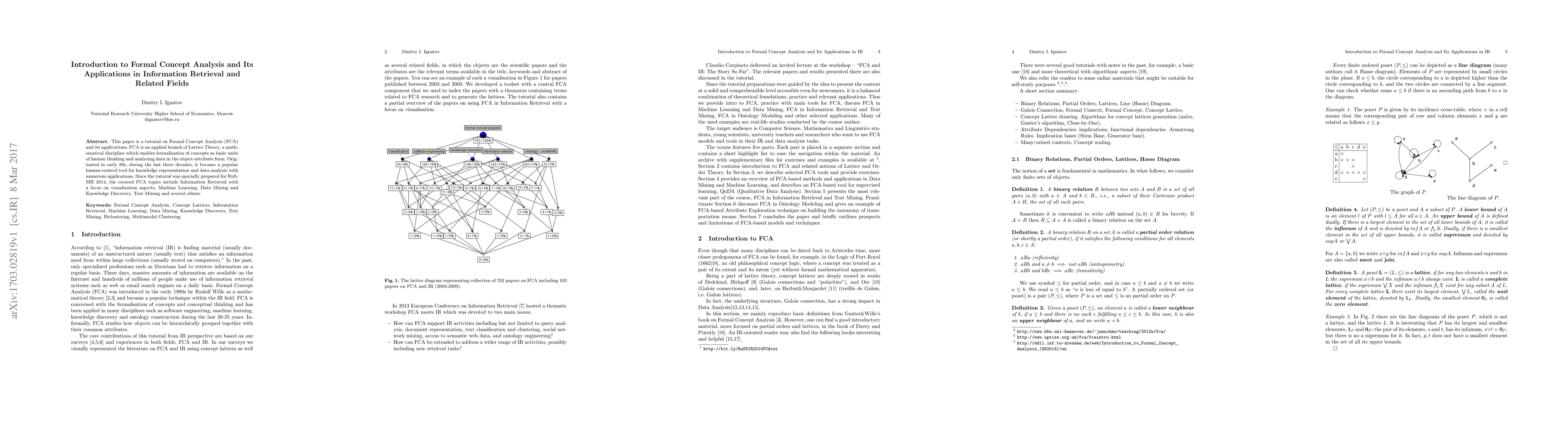 This paper is a tutorial on Formal Concept Analysis (FCA) and its applications. FCA is an applied branch of Lattice Theory, a mathematical discipline which enables formalisation of concepts as basic units of human thinking and analysing data in the object-attribute form. Originated in early 80s, during the last three decades, it became a popular human-centred tool for knowledge representation and data analysis with numerous applications. Since the tutorial was specially prepared for RuSSIR 2014, the covered FCA topics include Information Retrieval with a focus on visualisation aspects, Machine Learning, Data Mining and Knowledge Discovery, Text Mining and several others.