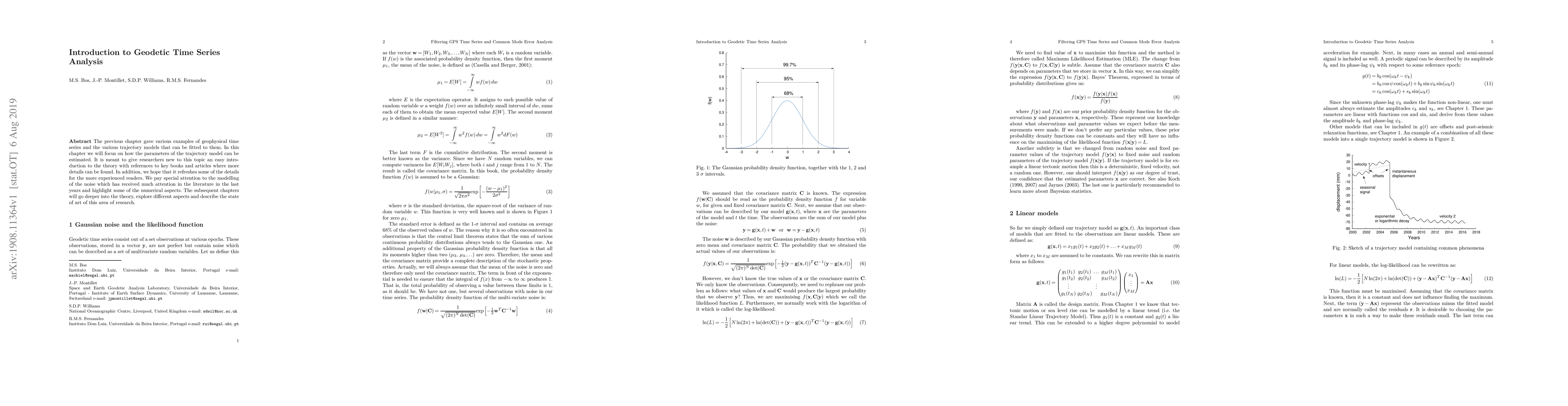 This chapter introduces geodetic time series analysis, focusing on fitting trajectory models to extract accurate geophysical information. It emphasizes parametric algorithms using Bayesian statistical tools to estimate parameters, with a special focus on noise modeling and numerical aspects.