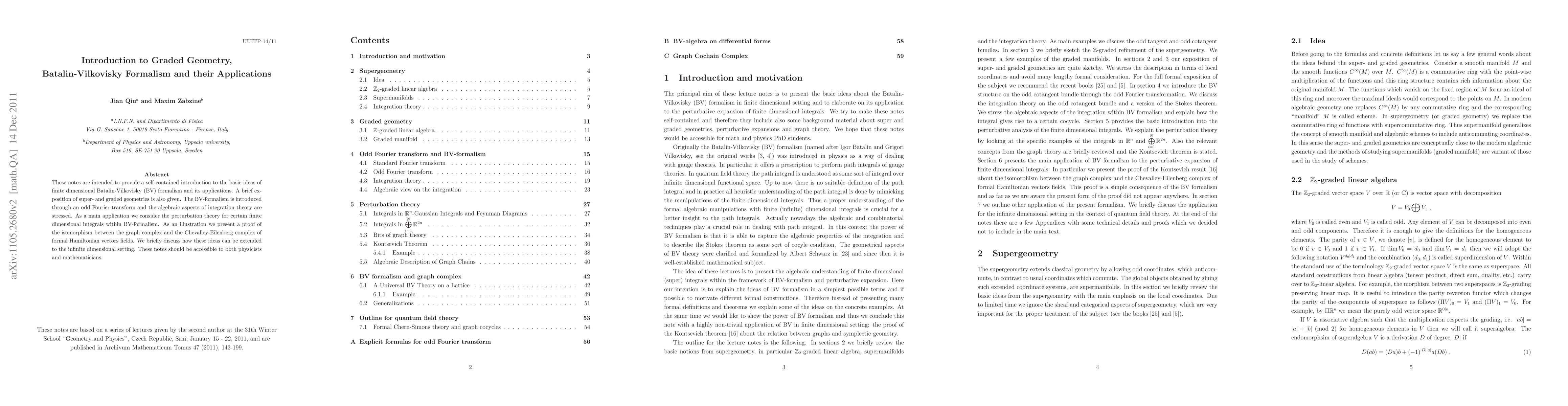 These notes offer an introduction to Batalin-Vilkovisky (BV) formalism, emphasizing graded geometry and algebraic integration theory, with applications in perturbation theory and an isomorphism proof between graph and Chevalley-Eilenberg complexes. The material is designed for both physicists and mathematicians.