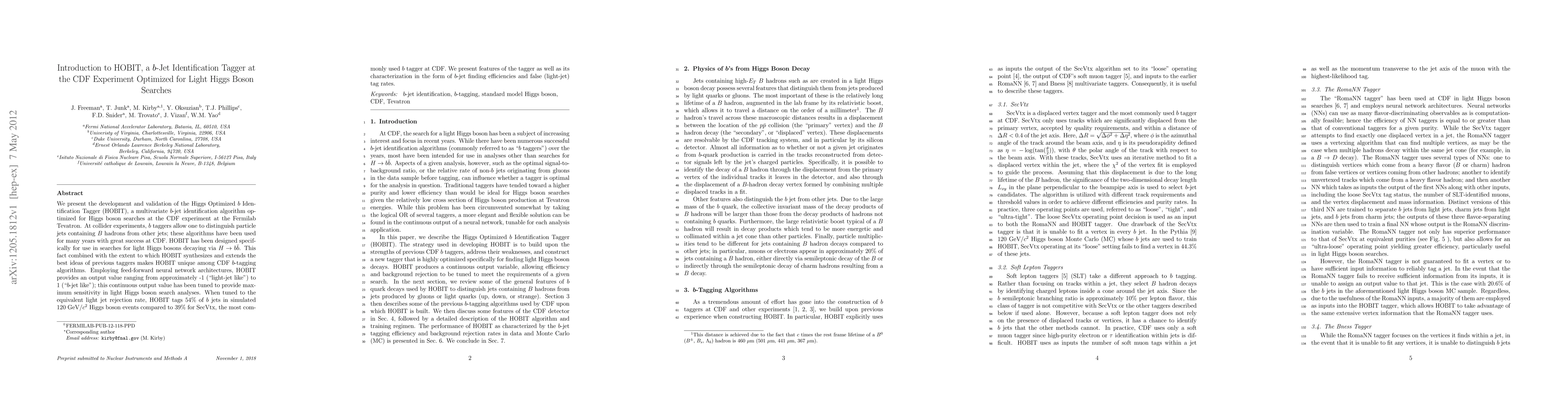 The paper introduces HOBIT, a novel b-jet identification algorithm developed for the CDF experiment at Fermilab, specifically optimized for light Higgs boson searches. HOBIT employs neural networks to distinguish b-jets from other jets, achieving higher tagging efficiency for b-jets in Higgs boson decay simulations compared to existing taggers.