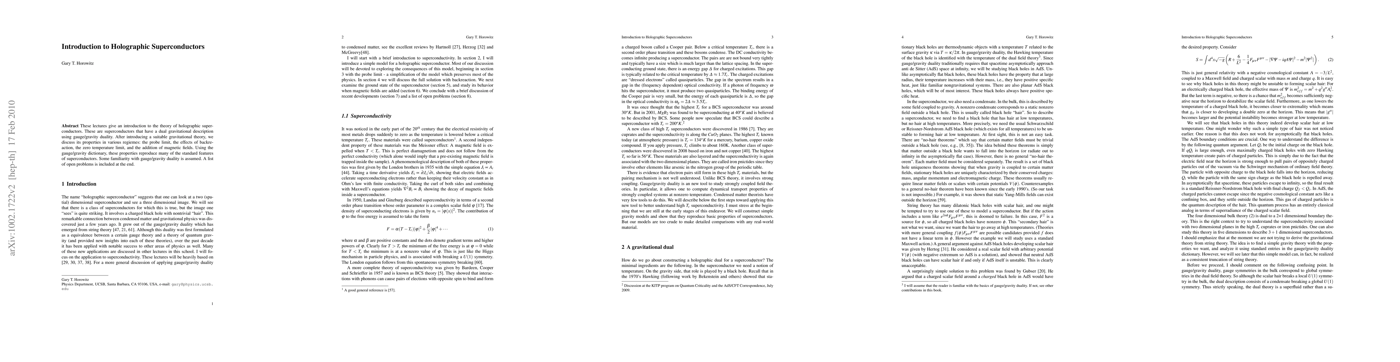This paper introduces holographic superconductors, which are superconductors described using gauge/gravity duality, and explores their properties in different regimes, including the probe limit and effects of magnetic fields. It assumes prior knowledge of gauge/gravity duality and concludes with a list of open research questions.