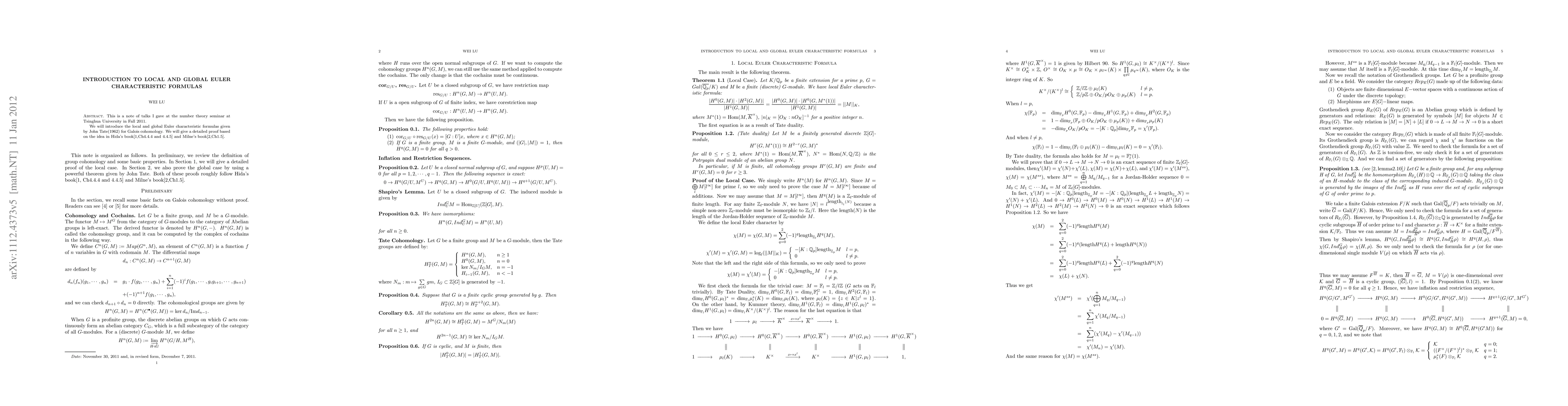 This is a note of talks I gave at the number theory seminar at Tsinghua University in Fall 2011. We will introduce the local and global Euler characteristic formulas given by John Tate(1962) for Galois cohomology. We will give a detailed proof based on the idea in Hida's book[1,ch4.4.5] and Milne's book[2,ch1.5].