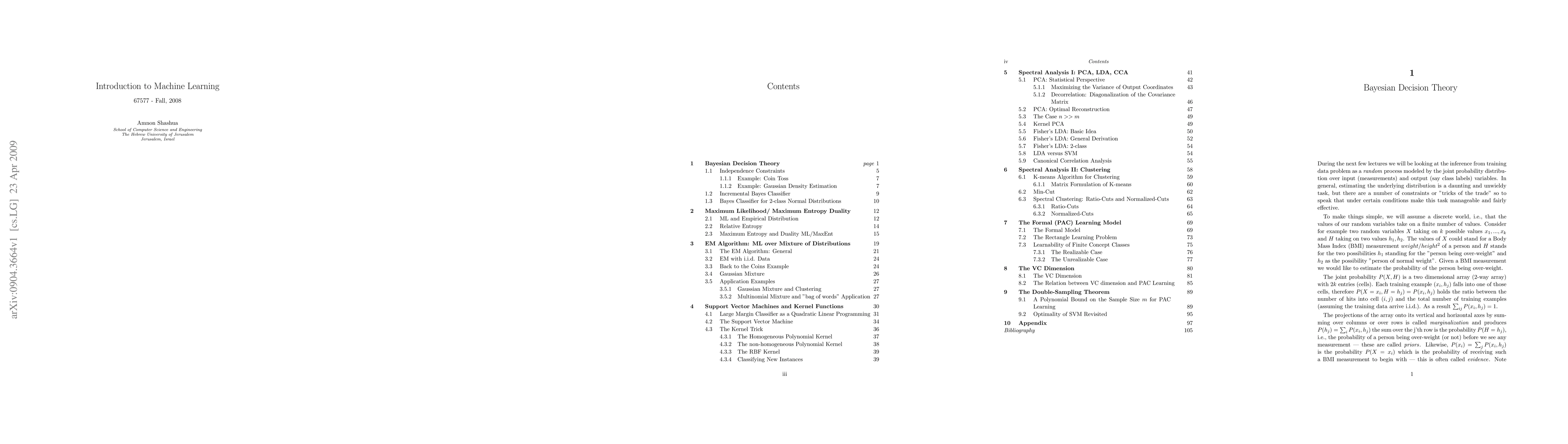 Introduction to Machine learning covering Statistical Inference (Bayes, EM, ML/MaxEnt duality), algebraic and spectral methods (PCA, LDA, CCA, Clustering), and PAC learning (the Formal model, VC dimension, Double Sampling theorem).