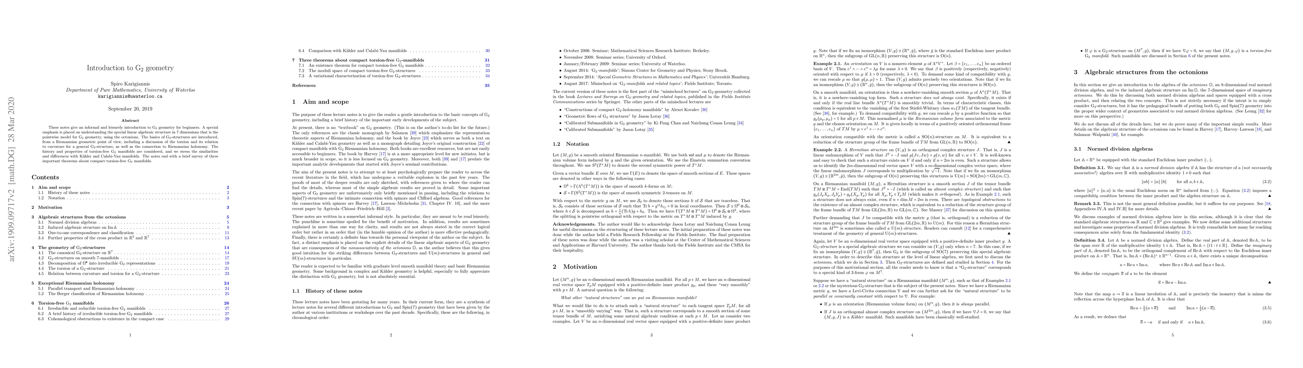 These notes give an informal and leisurely introduction to $\mathrm{G}_2$ geometry for beginners. A special emphasis is placed on understanding the special linear algebraic structure in $7$ dimensions that is the pointwise model for $\mathrm{G}_2$ geometry, using the octonions. The basics of $\mathrm{G}_2$-structures are introduced, from a Riemannian geometric point of view, including a discussion of the torsion and its relation to curvature for a general $\mathrm{G}_2$-structure, as well as the connection to Riemannian holonomy. The history and properties of torsion-free $\mathrm{G}_2$ manifolds are considered, and we stress the similarities and differences with Kahler and Calabi-Yau manifolds. The notes end with a brief survey of three important theorems about compact torsion-free $\mathrm{G}_2$ manifolds.