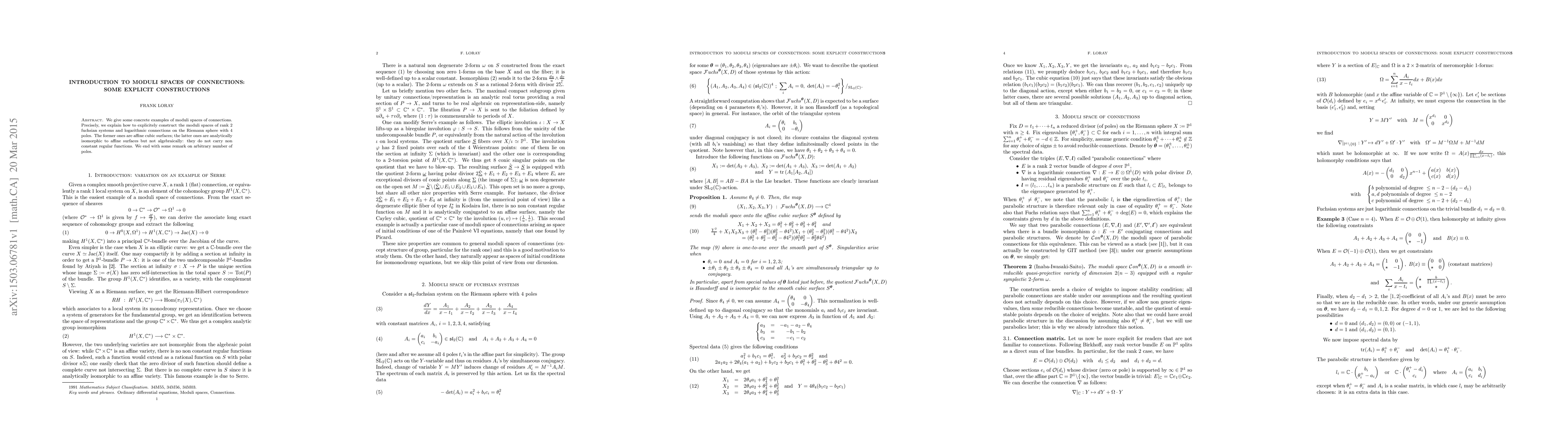 We give some concrete examples of moduli spaces of connections. Precisely, we explain how to explicitly construct the moduli spaces of rank 2 fuchsian systems and logarithmic connections on the Riemann sphere with 4 poles. The former ones are affine cubic surfaces; the latter ones are analytically isomorphic to affine surfaces but not algebraically: they do not carry non constant regular functions. We end with some remark on arbitrary number of poles.