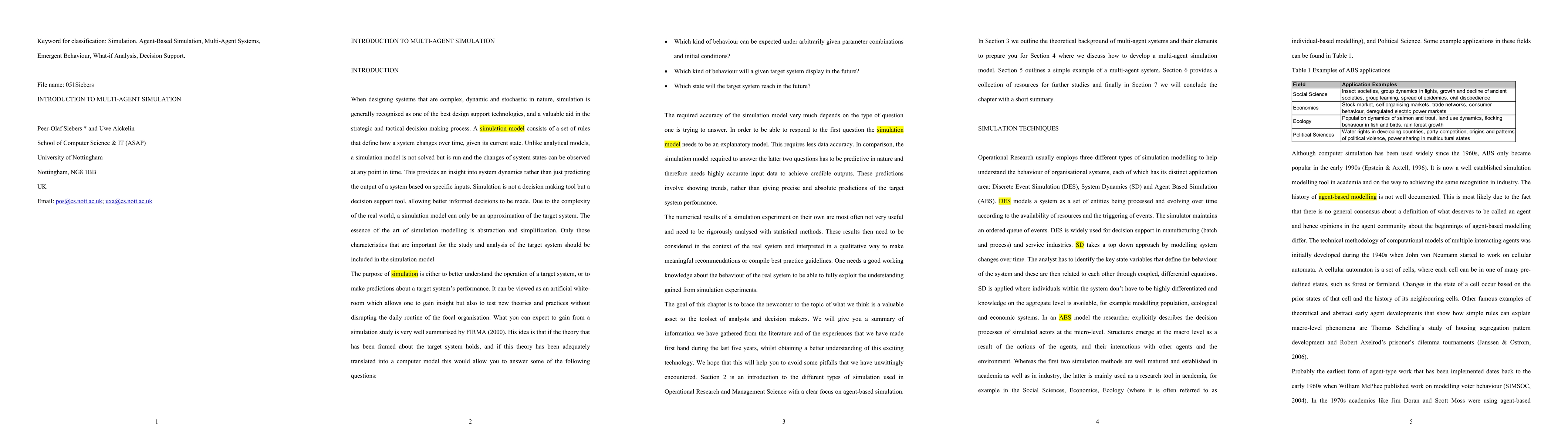 When designing systems that are complex, dynamic and stochastic in nature, simulation is generally recognised as one of the best design support technologies, and a valuable aid in the strategic and tactical decision making process. A simulation model consists of a set of rules that define how a system changes over time, given its current state. Unlike analytical models, a simulation model is not solved but is run and the changes of system states can be observed at any point in time. This provides an insight into system dynamics rather than just predicting the output of a system based on specific inputs. Simulation is not a decision making tool but a decision support tool, allowing better informed decisions to be made. Due to the complexity of the real world, a simulation model can only be an approximation of the target system. The essence of the art of simulation modelling is abstraction and simplification. Only those characteristics that are important for the study and analysis of the target system should be included in the simulation model.