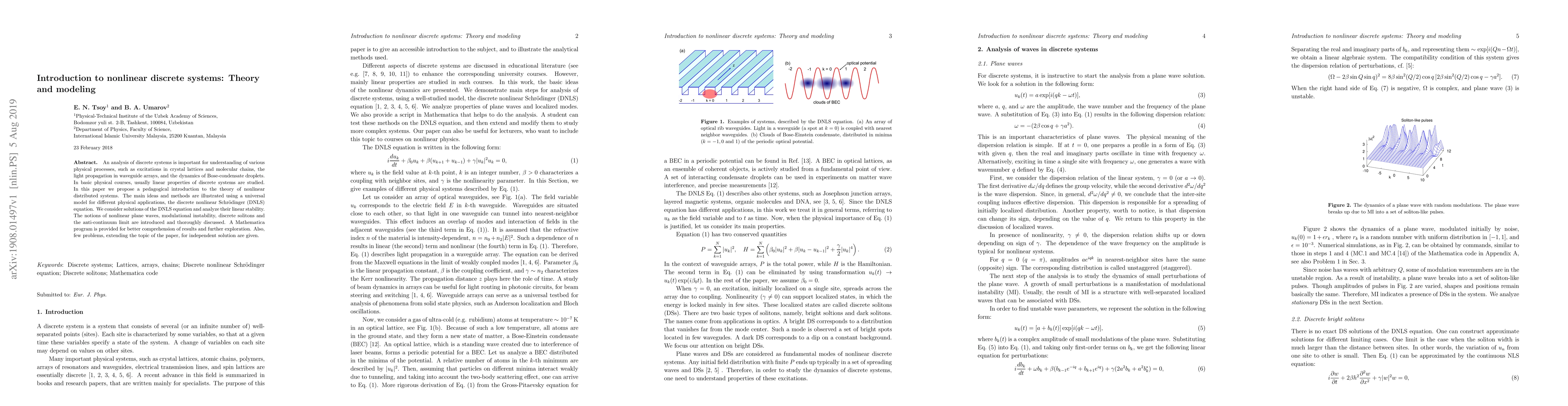 An analysis of discrete systems is important for understanding of various physical processes, such as excitations in crystal lattices and molecular chains, the light propagation in waveguide arrays, and the dynamics of Bose-condensate droplets. In basic physical courses, usually linear properties of discrete systems are studied. In this paper we propose a pedagogical introduction to the theory of nonlinear distributed systems. The main ideas and methods are illustrated using a universal model for different physical applications, the discrete nonlinear Schr\"{o}dinger (DNLS) equation. We consider solutions of the DNLS equation and analyze their linear stability. The notions of nonlinear plane waves, modulational instability, discrete solitons and the anti-continuum limit are introduced and thoroughly discussed. A Mathematica program is provided for better comprehension of results and further exploration. Also, few problems, extending the topic of the paper, for independent solution are given.