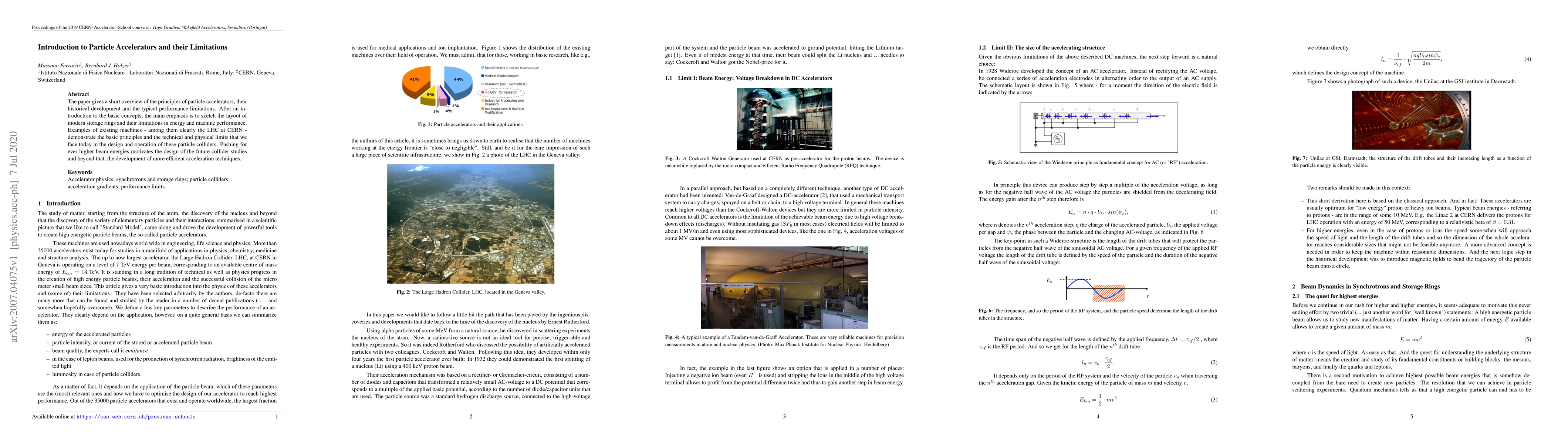 This paper provides an overview of particle accelerator principles, historical development, and performance limitations, focusing on modern storage rings like the LHC at CERN, and discusses the technical and physical limits in current designs and future accelerator studies.