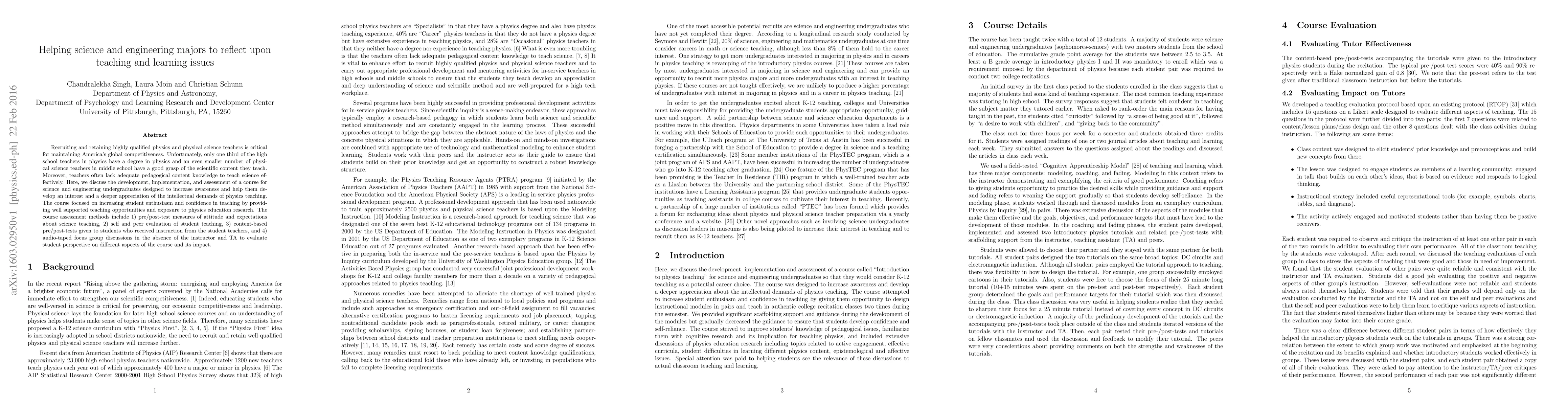 Recruiting and retaining highly qualified physics and physical science teachers is critical for maintaining America's global competitiveness. Unfortunately, only one third of the high school teachers in physics have a degree in physics and an even smaller number of physical science teachers in middle school have a good grasp of the scientific content they teach. Moreover, teachers often lack adequate pedagogical content knowledge to teach science effectively. Here, we discuss the development, implementation, and assessment of a course for science and engineering undergraduates designed to increase awareness and help them develop an interest and a deeper appreciation of the intellectual demands of physics teaching. The course focused on increasing student enthusiasm and confidence in teaching by providing well supported teaching opportunities and exposure to physics education research. The course assessment methods include 1) pre/post-test measures of attitude and expectations about science teaching, 2) self and peer evaluation of student teaching, 3) content-based pre/post-tests given to students who received instruction from the student teachers, and 4) audio-taped focus group discussions in the absence of the instructor and TA to evaluate student perspective on different aspects of the course and its impact.