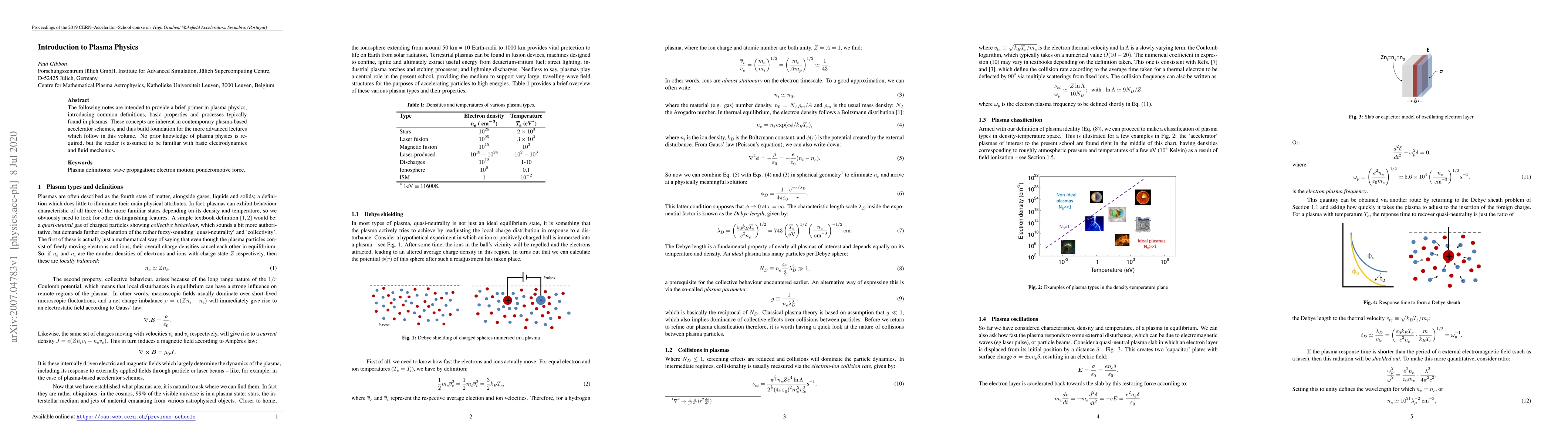 The following notes are intended to provide a brief primer in plasma physics, introducing common definitions, basic properties and processes typically found in plasmas. These concepts are inherent in contemporary plasma-based accelerator schemes, and thus build foundation for the more advanced lectures which follow in this volume. No prior knowledge of plasma physics is required, but the reader is assumed to be familiar with basic electrodynamics and fluid mechanics.