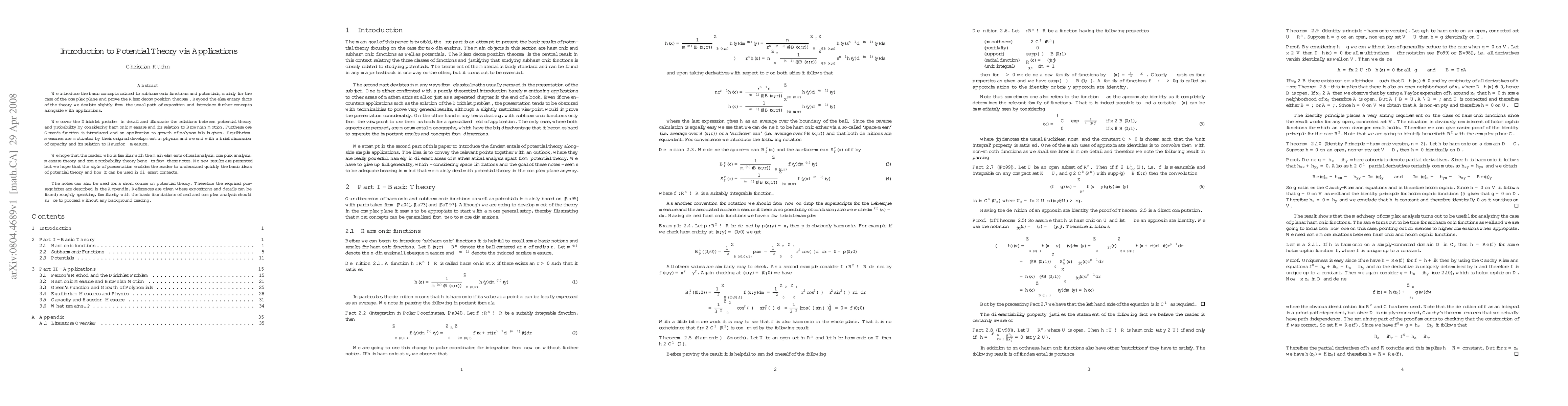 This paper introduces fundamental concepts in potential theory, focusing on subharmonic functions and the Riesz decomposition theorem, with applications to the complex plane. It covers the Dirichlet problem, harmonic measure, and Green's functions, and concludes with a discussion on equilibrium measures and capacity. The aim is to provide a clear understanding of potential theory for readers familiar with real and complex analysis.