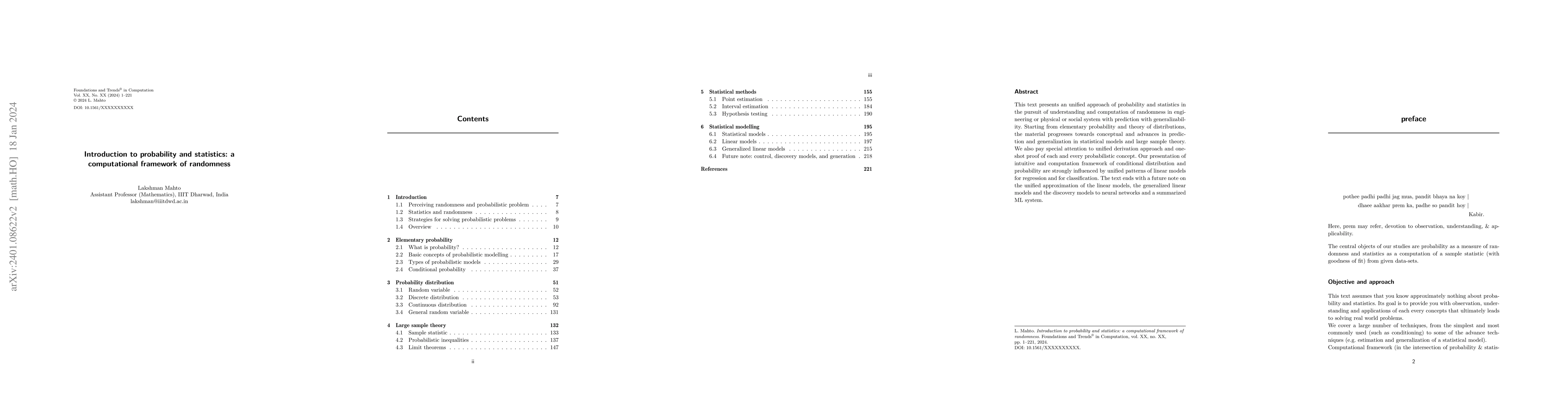This text offers a unified computational framework for understanding probability and statistics, focusing on randomness in various systems, with an emphasis on prediction and generalization. It covers elementary probability, advanced statistical models, and large sample theory, while highlighting unified derivations and computational intuitions for linear models in regression and classification.