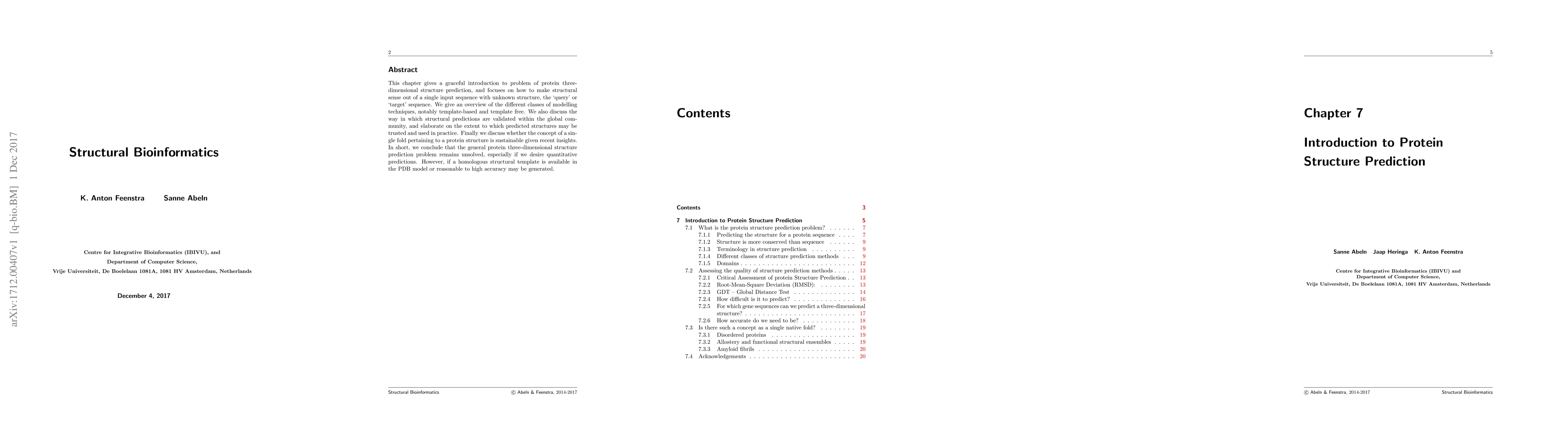 This chapter introduces protein three-dimensional structure prediction, outlining techniques like template-based and template-free modeling, and discusses the validation and reliability of predictions. Despite recent insights, the general problem remains unsolved, though high accuracy can be achieved with homologous templates.