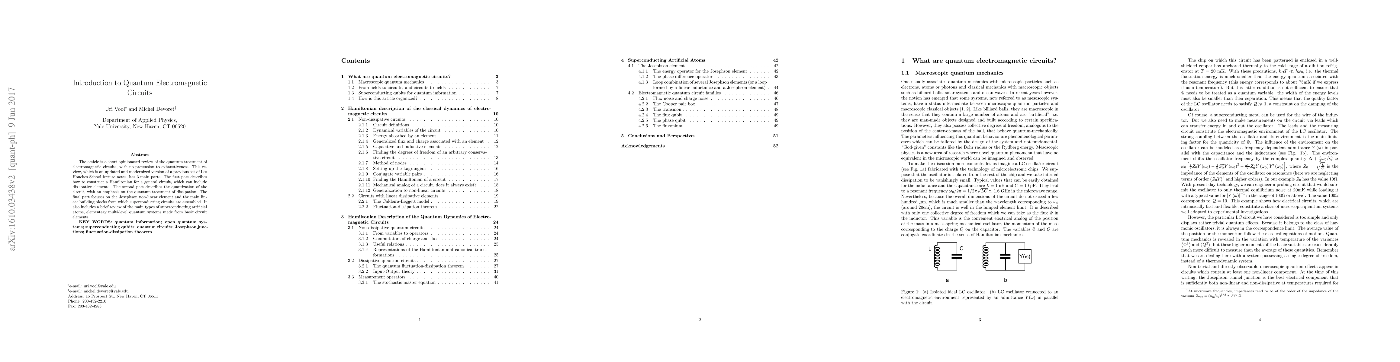 The article is a short opinionated review of the quantum treatment of electromagnetic circuits, with no pretension to exhaustiveness. This review, which is an updated and modernized version of a previous set of Les Houches School lecture notes, has 3 main parts. The first part describes how to construct a Hamiltonian for a general circuit, which can include dissipative elements. The second part describes the quantization of the circuit, with an emphasis on the quantum treatment of dissipation. The final part focuses on the Josephson non-linear element and the main linear building blocks from which superconducting circuits are assembled. It also includes a brief review of the main types of superconducting artificial atoms, elementary multi-level quantum systems made from basic circuit elements.