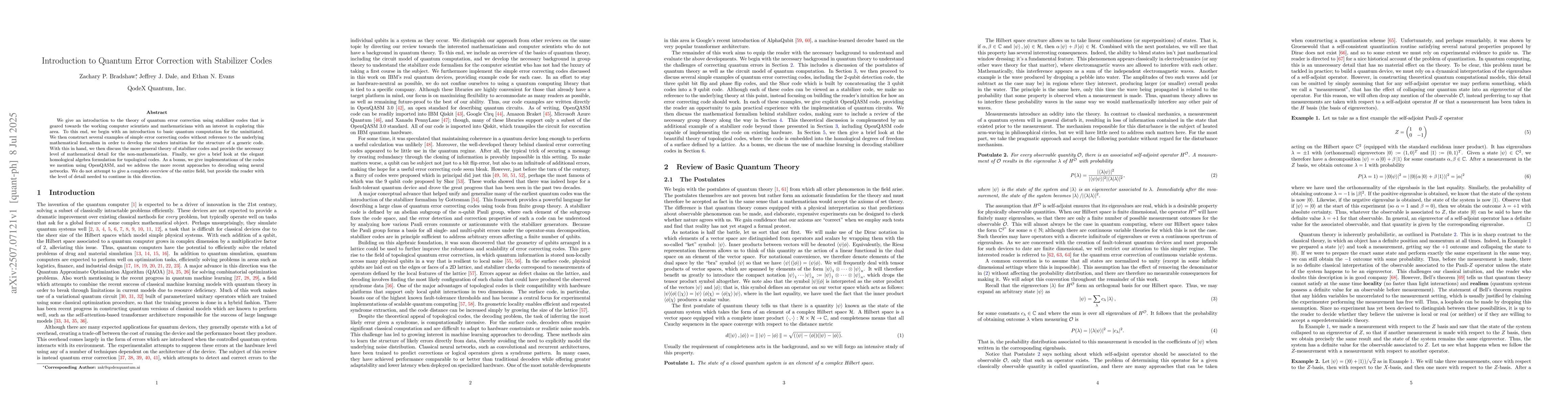 The paper introduces stabilizer codes for quantum error correction, presenting a balance of intuition and mathematical detail, along with practical implementations and modern decoding approaches.