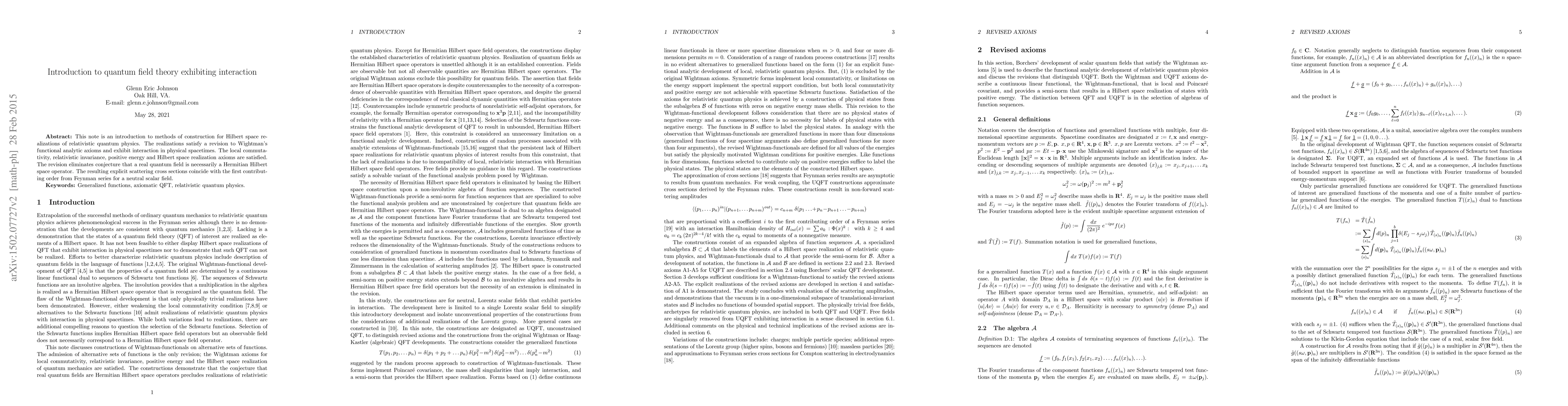This note is an introduction to methods of construction for Hilbert space realizations of relativistic quantum physics. The realizations satisfy a revision to Wightman's functional analytic axioms and exhibit interaction in physical spacetimes. The local commutativity, relativistic invariance, positive energy and Hilbert space realization axioms are satisfied. The revision eliminates conjecture that a real quantum field is necessarily a Hermitian Hilbert space operator. The resulting explicit scattering cross sections coincide with the first contributing order from Feynman series for a neutral scalar field.