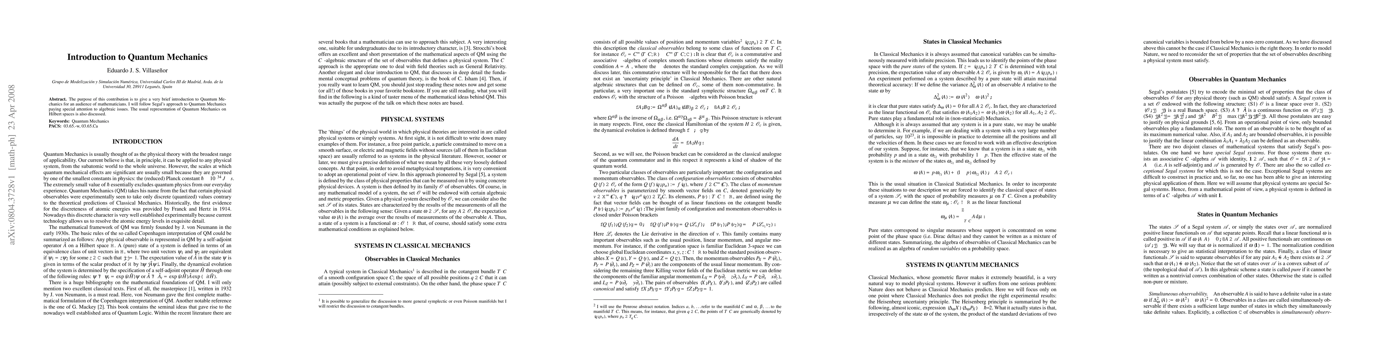 The purpose of this contribution is to give a very brief introduction to Quantum Mechanics for an audience of mathematicians. I will follow Segal's approach to Quantum Mechanics paying special attention to algebraic issues. The usual representation of Quantum Mechanics on Hilbert spaces is also discussed.