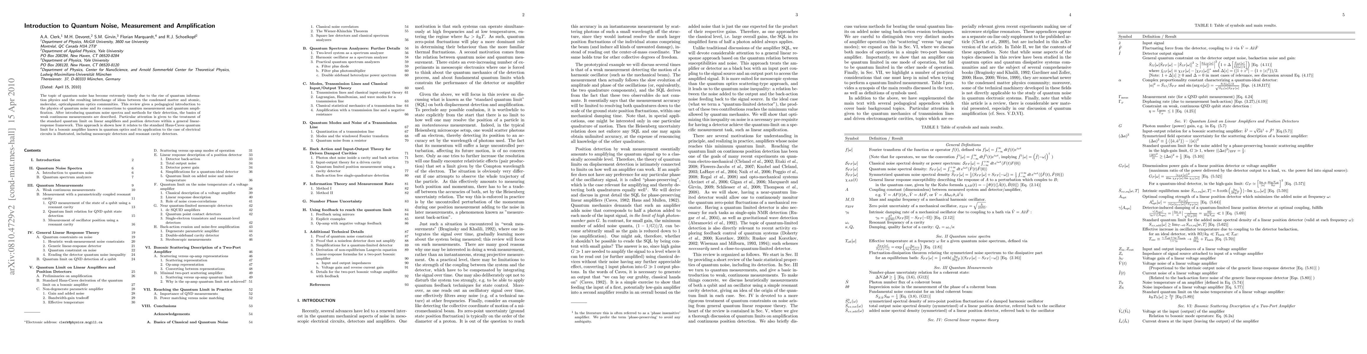 The topic of quantum noise has become extremely timely due to the rise of quantum information physics and the resulting interchange of ideas between the condensed matter and AMO/quantum optics communities. This review gives a pedagogical introduction to the physics of quantum noise and its connections to quantum measurement and quantum amplification. After introducing quantum noise spectra and methods for their detection, we describe the basics of weak continuous measurements. Particular attention is given to treating the standard quantum limit on linear amplifiers and position detectors using a general linear-response framework. We show how this approach relates to the standard Haus-Caves quantum limit for a bosonic amplifier known in quantum optics, and illustrate its application for the case of electrical circuits, including mesoscopic detectors and resonant cavity detectors.