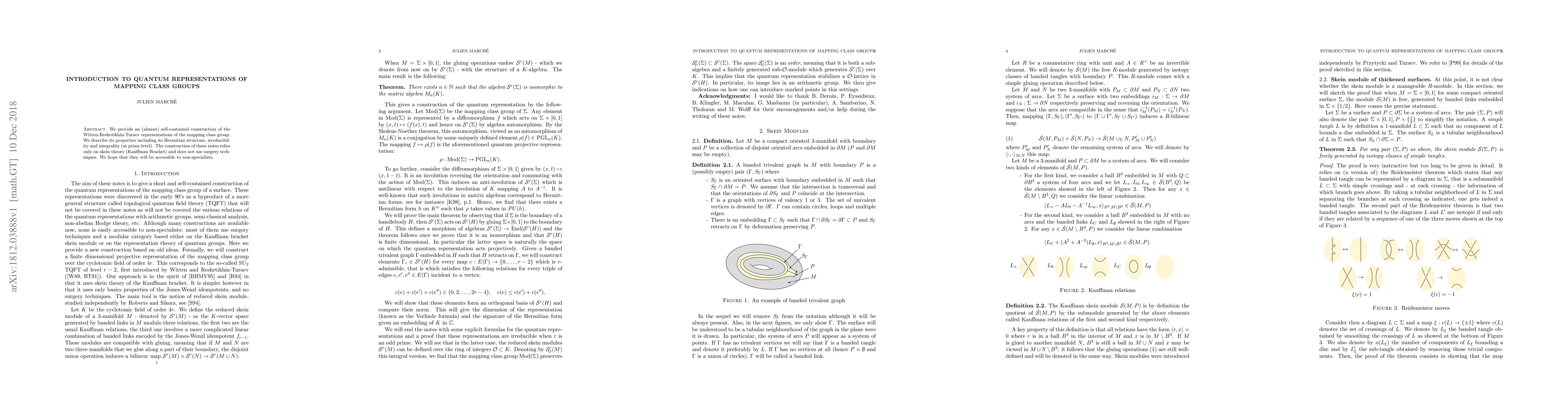 We provide an (almost) self-contained construction of the Witten-Reshetikhin-Turaev representations of the mapping class group. We describe its properties including its Hermitian structure, irreducibility and integrality (at prime level). The construction of these notes relies only on skein theory (Kauffman Bracket) and does not use surgery techniques. We hope that they will be accessible to non-specialists.