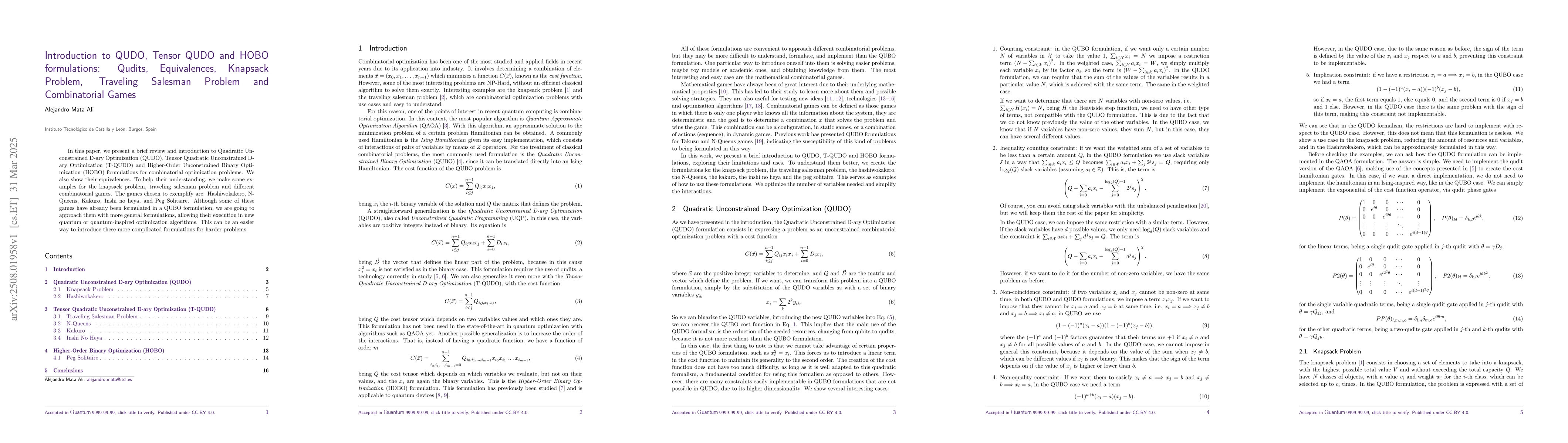 In this paper, we present a brief review and introduction to Quadratic Unconstrained D-ary Optimization (QUDO), Tensor Quadratic Unconstrained D-ary Optimization (T-QUDO) and Higher-Order Unconstrained Binary Optimization (HOBO) formulations for combinatorial optimization problems. We also show their equivalences. To help their understanding, we make some examples for the knapsack problem, traveling salesman problem and different combinatorial games. The games chosen to exemplify are: Hashiwokakero, N-Queens, Kakuro, Inshi no heya, and Peg Solitaire. Although some of these games have already been formulated in a QUBO formulation, we are going to approach them with more general formulations, allowing their execution in new quantum or quantum-inspired optimization algorithms. This can be an easier way to introduce these more complicated formulations for harder problems.