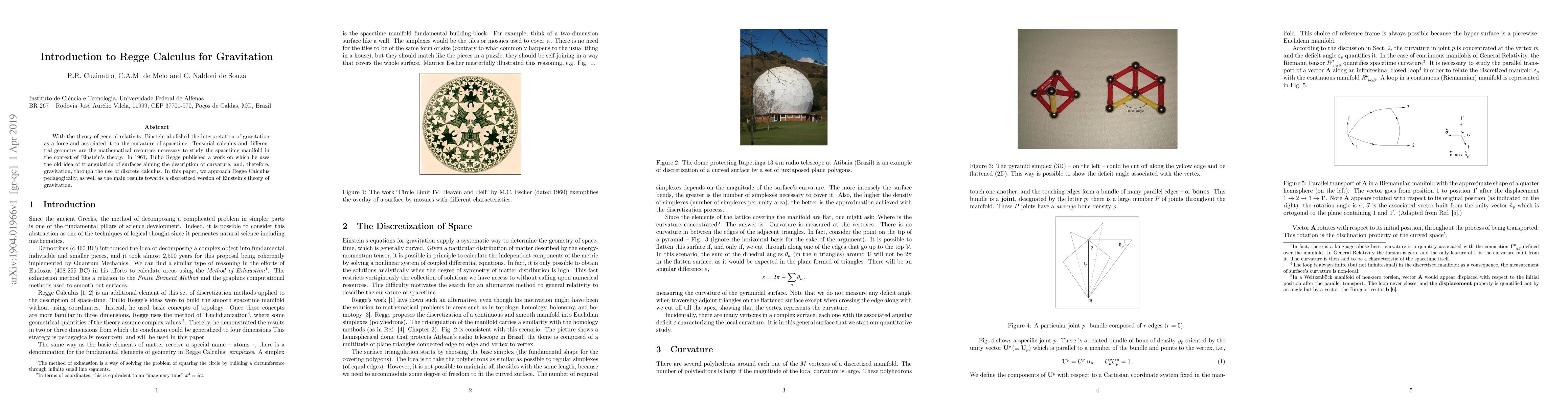 This paper introduces Regge Calculus, a discrete approach to general relativity developed by Tullio Regge in 1961, which uses triangulation to describe spacetime curvature and gravitation through a simplified calculus. It aims to provide a pedagogical overview of the method and its implications for a discretized version of Einstein's theory.