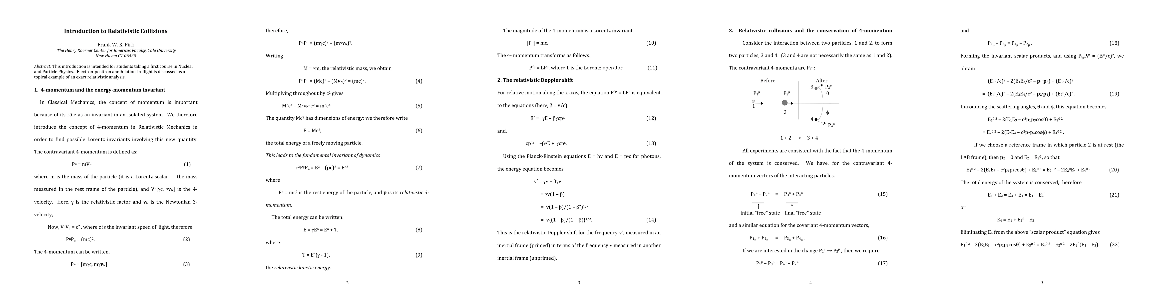 An introduction to relativistic collisions; analysis of electron-positron annihilation-in-flight given as a practical example.