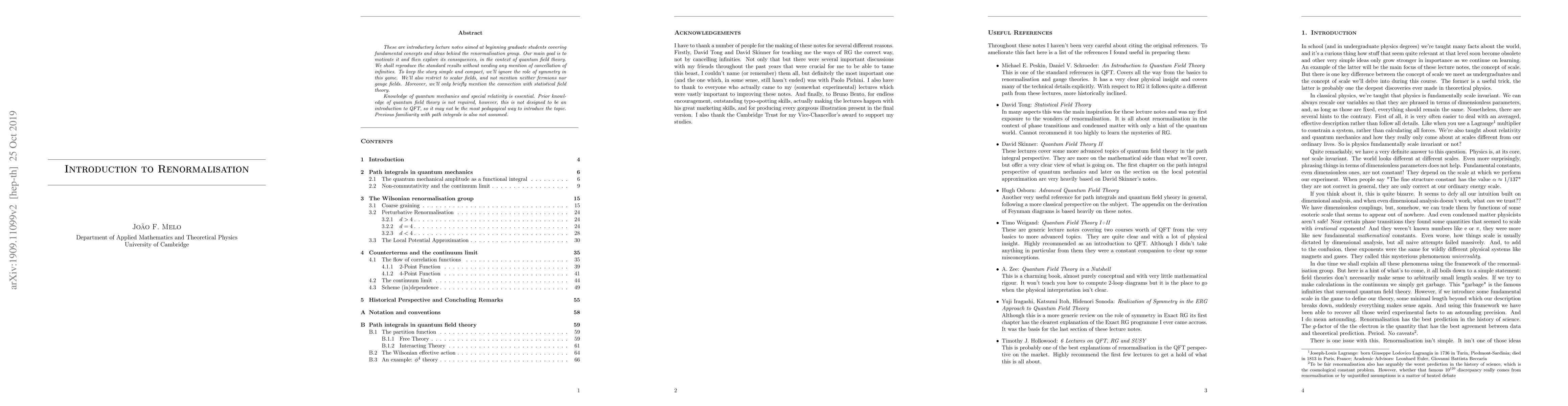 These are introductory lecture notes aimed at beginning graduate students covering fundamental concepts and ideas behind the renormalisation group. Our main goal is to motivate it and then explore its consequences, in the context of quantum field theory. We shall reproduce the standard results without needing any mention of cancellation of infinities. To keep the story simple and compact, we'll ignore the role of symmetry in this game. We'll also restrict to scalar fields, and not mention neither fermions nor gauge fields. Moreover, we'll only briefly mention the connection with statistical field theory. Knowledge of quantum mechanics and special relativity is essential. Prior knowledge of quantum field theory is not required, however, this is not designed to be an introduction to QFT, so it may not be the most pedagogical way to introduce the topic. Previous familiarity with path integrals is also not assumed.