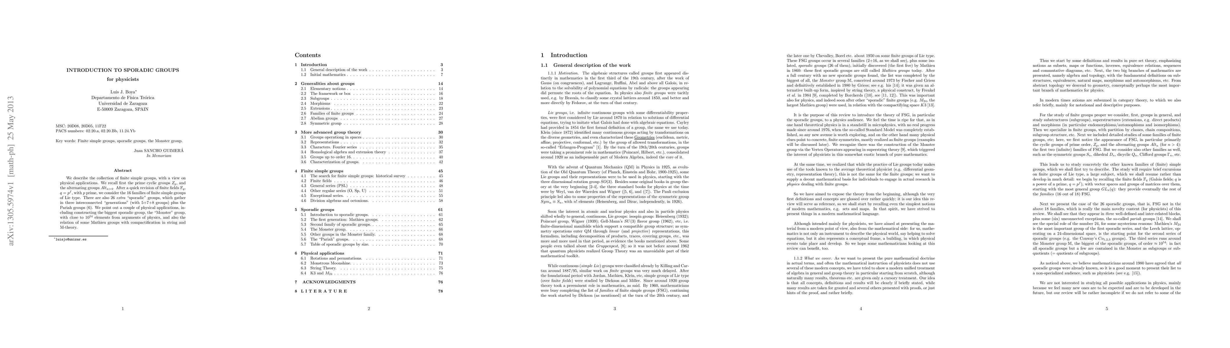 We describe the collection of finite simple groups, with a view on physical applications. We recall first the prime cyclic groups $Z_p$, and the alternating groups $Alt_{n>4}$. After a quick revision of finite fields $\mathbb{F}_q$, $q = p^f$, with $p$ prime, we consider the 16 families of finite simple groups of Lie type. There are also 26 \emph{extra} "sporadic" groups, which gather in three interconnected "generations" (with 5+7+8 groups) plus the Pariah groups (6). We point out a couple of physical applications, including constructing the biggest sporadic group, the "Monster" group, with close to $10^{54}$ elements from arguments of physics, and also the relation of some Mathieu groups with compactification in string and M-theory.