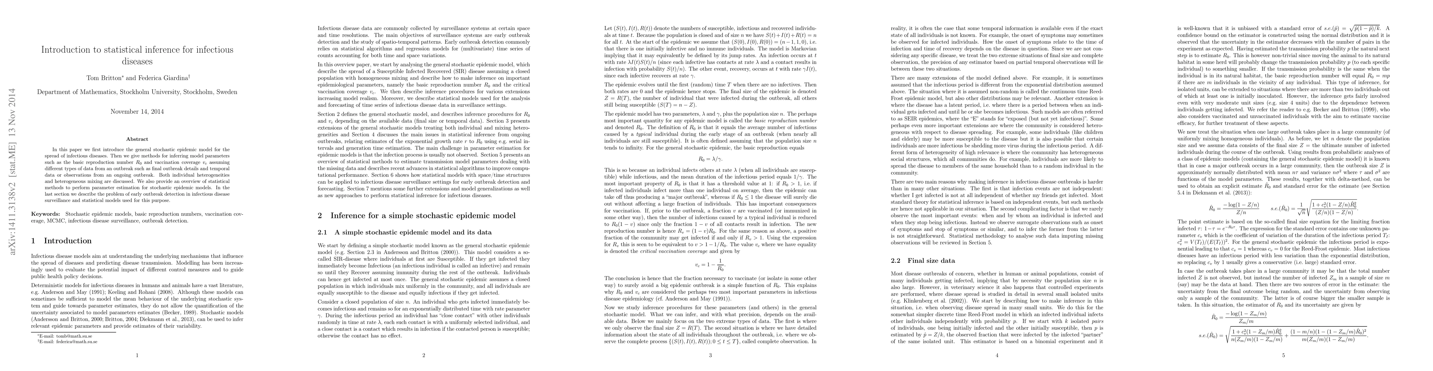 This paper introduces the stochastic epidemic model for infectious diseases and outlines methods for estimating parameters like $R_0$ and vaccination coverage from various outbreak data types. It also discusses statistical techniques for parameter estimation and early outbreak detection in disease surveillance.