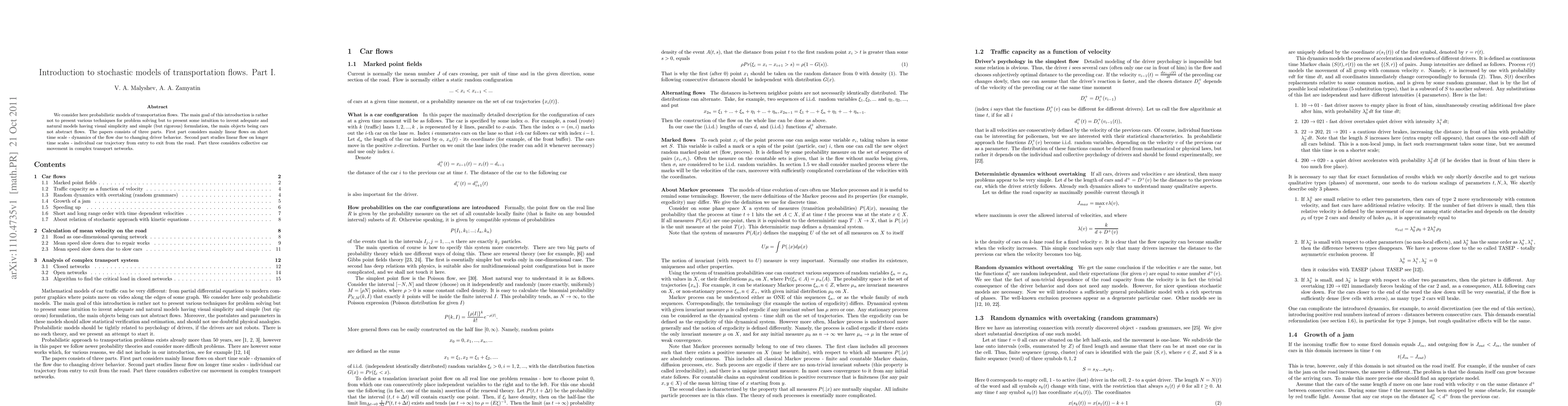 We consider here probabilistic models of transportation flows. The main goal of this introduction is rather not to present various techniques for problem solving but to present some intuition to invent adequate and natural models having visual simplicity and simple (but rigorous) formulation, the main objects being cars not abstract flows. The papers consists of three parts. First part considers mainly linear flows on short time scale - dynamics of the flow due to changing driver behavior. Second part studies linear flow on longer time scales - individual car trajectory from entry to exit from the road. Part three considers collective car movement in complex transport networks.