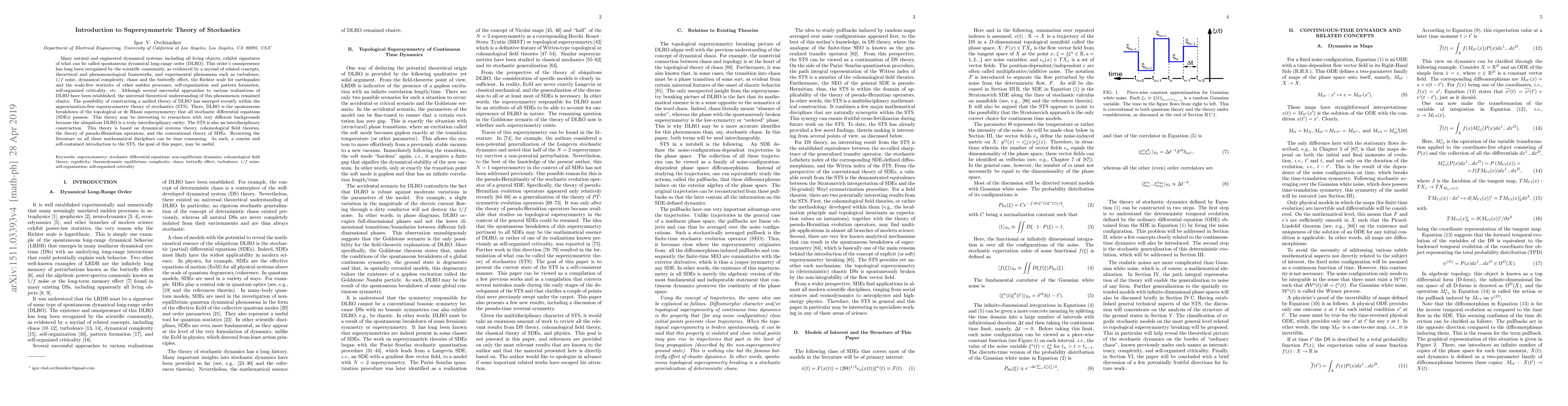 Many natural and engineered dynamical systems, including all living objects, exhibit signatures of what can be called spontaneous dynamical long-range order (DLRO). This order's omnipresence has long been recognized by the scientific community, as evidenced by a myriad of related concepts, theoretical and phenomenological frameworks, and experimental phenomena such as turbulence, $1/f$ noise, dynamical complexity, chaos and the butterfly effect, the Richter scale for earthquakes and the scale-free statistics of other sudden processes, self-organization and pattern formation, self-organized criticality, etc. Although several successful approaches to various realizations of DLRO have been established, the universal theoretical understanding of this phenomenon remained elusive. The possibility of constructing a unified theory of DLRO has emerged recently within the approximation-free supersymmetric theory of stochastics (STS). There, DLRO is the spontaneous breakdown of the topological or de Rham supersymmetry that all stochastic differential equations (SDEs) possess. This theory may be interesting to researchers with very different backgrounds because the ubiquitous DLRO is a truly interdisciplinary entity. The STS is also an interdisciplinary construction. This theory is based on dynamical systems theory, cohomological field theories, the theory of pseudo-Hermitian operators, and the conventional theory of SDEs. Reviewing the literature on all these mathematical disciplines can be time-consuming. As such, a concise and self-contained introduction to the STS, the goal of this paper, may be useful.