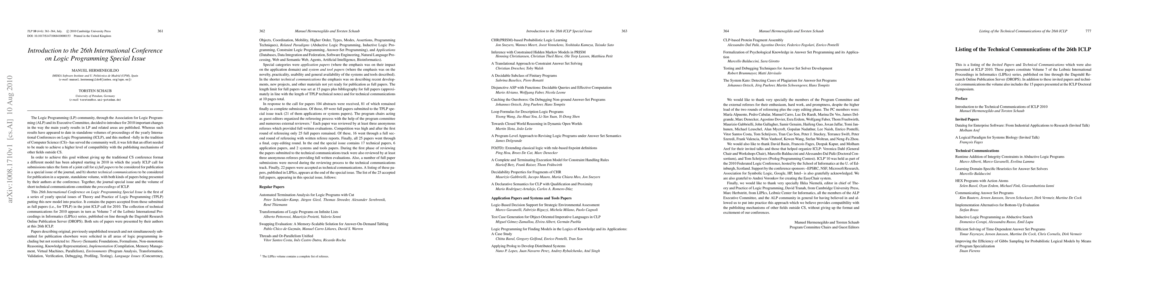 This preface introduces the special issue stemming from the 26th International Conference on Logic Programming, highlighting key contributions and advancements in the field of logic programming. It sets the stage for the collection of papers that explore innovative research and developments.