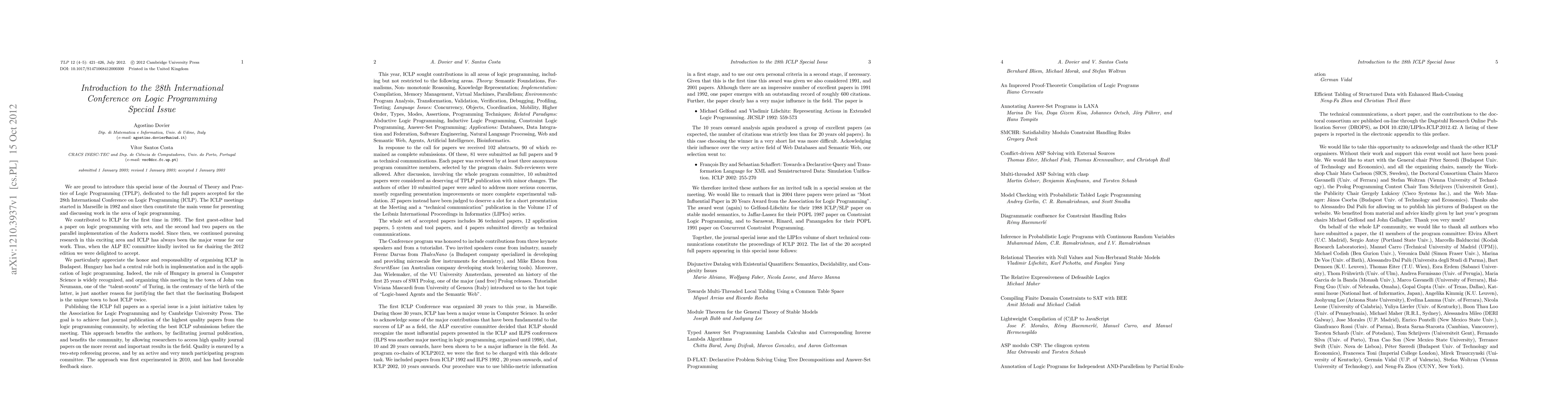 This special issue of the Journal of Theory and Practice of Logic Programming celebrates 28 years of International Conference on Logic Programming, highlighting key advancements in logic programming research. The ICLP conference has established itself as a premier venue for discussing work in logic programming since its inception in 1982.
