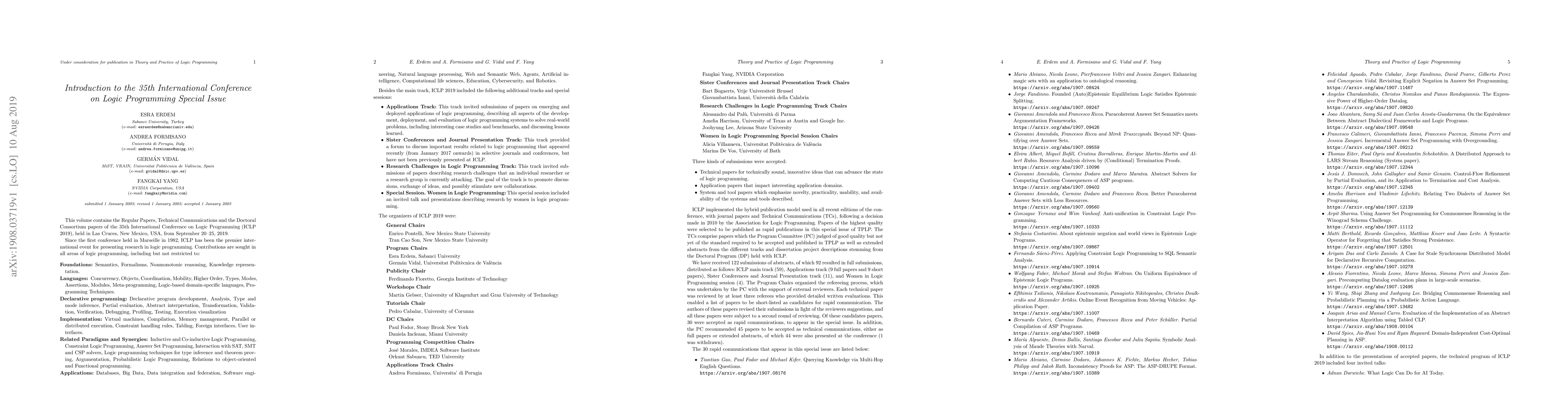 We are proud to introduce this special issue of Theory and Practice of Logic Programming (TPLP), dedicated to the regular papers accepted for the 35th International Conference on Logic Programming (ICLP). The ICLP meetings started in Marseille in 1982 and since then constitute the main venue for presenting and discussing work in the area of logic programming. Under consideration for acceptance in TPLP.