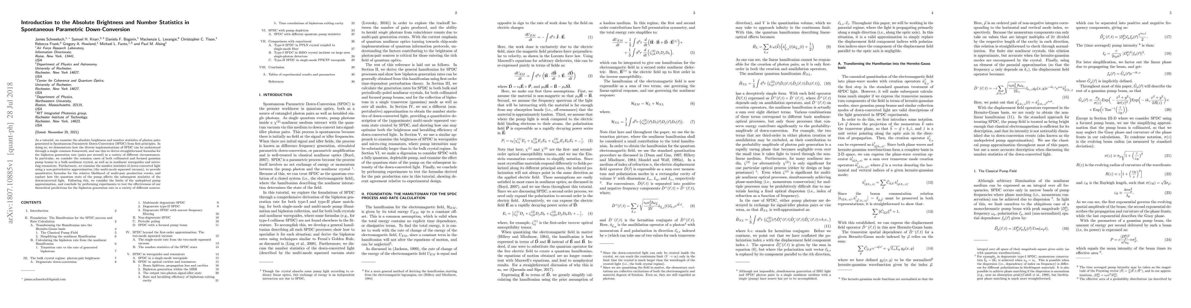 This research paper introduces a common framework for understanding absolute brightness and number statistics in Spontaneous Parametric Down-Conversion (SPDC), providing formulas for biphoton generation rate and exploring the effects of pump quantum state on downconverted light statistics.