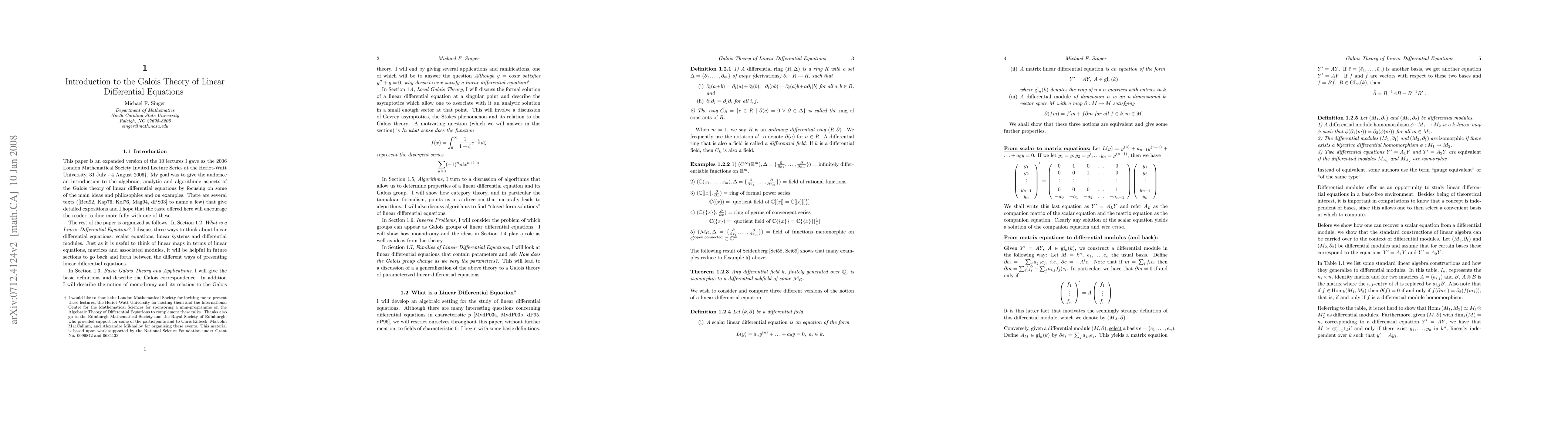 Summary: This paper offers an in-depth introduction to the Galois theory applied to linear differential equations, based on a lecture series held in 2006, and aims to elucidate the connections between differential equations and algebraic structures.