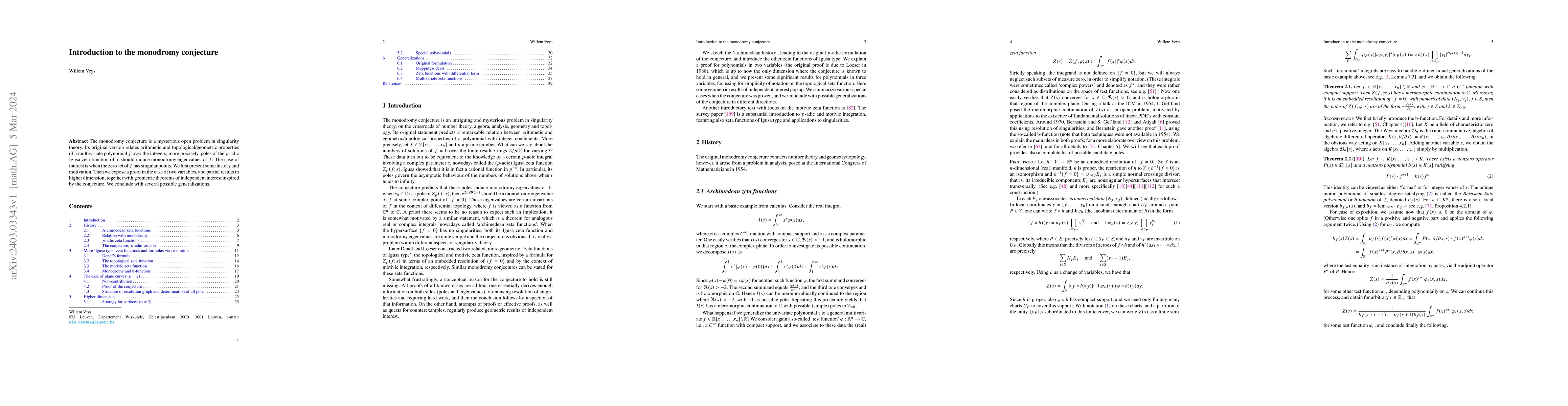The monodromy conjecture links arithmetic properties of multivariate polynomials with their topological/geometric features, particularly focusing on singular points and their $p$-adic Igusa zeta functions. The paper provides a proof for the two-variable case and partial results for higher dimensions, alongside independent geometric theorems, and explores potential generalizations.