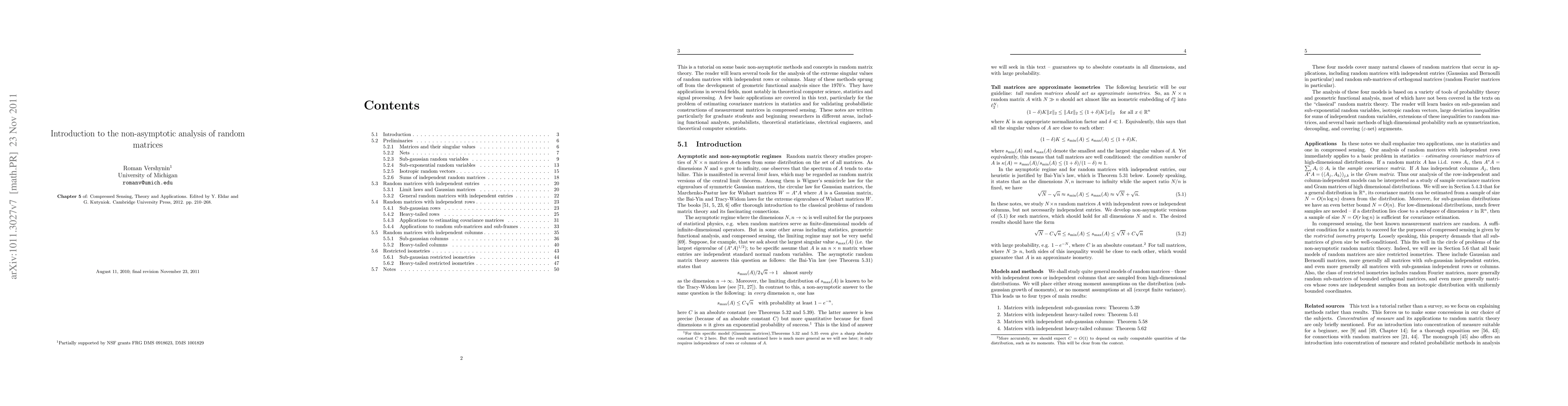 This is a tutorial on some basic non-asymptotic methods and concepts in random matrix theory. The reader will learn several tools for the analysis of the extreme singular values of random matrices with independent rows or columns. Many of these methods sprung off from the development of geometric functional analysis since the 1970's. They have applications in several fields, most notably in theoretical computer science, statistics and signal processing. A few basic applications are covered in this text, particularly for the problem of estimating covariance matrices in statistics and for validating probabilistic constructions of measurement matrices in compressed sensing. These notes are written particularly for graduate students and beginning researchers in different areas, including functional analysts, probabilists, theoretical statisticians, electrical engineers, and theoretical computer scientists.