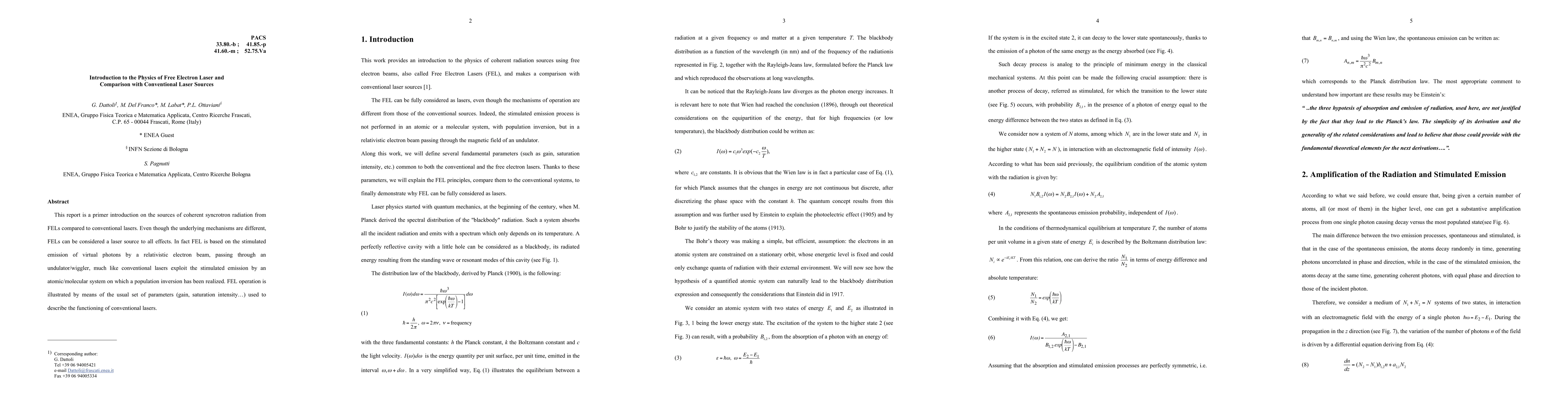 This paper provides an introduction to the physics of free electron lasers (FELs), comparing their coherent synchrotron radiation mechanisms with conventional lasers. Despite different underlying mechanisms, FELs operate similarly to conventional lasers through stimulated emission, using relativistic electron beams and undulators.