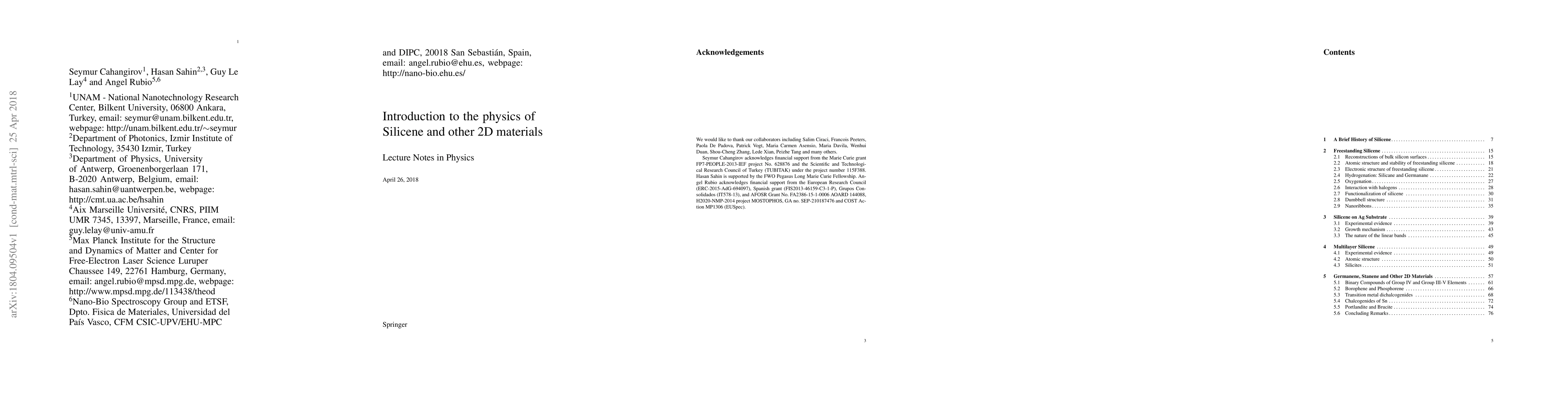 This book provides an introductory overview of the physics of silicene and other 2D materials, tracing the history and bonding nature of silicene, and detailing its atomic and electronic structure, experimental realization, and interactions with substrates. It also compares silicene with other group IV, V, and III elements, as well as transition metal dichalcogenides.