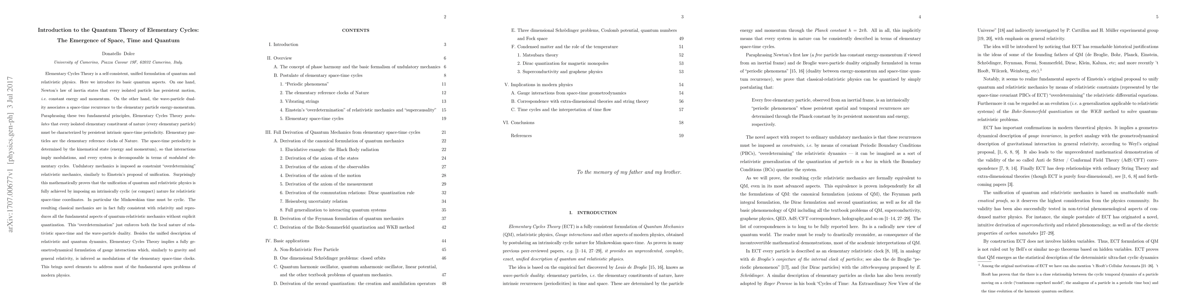 Elementary Cycles Theory is a self-consistent, unified formulation of quantum and relativistic physics. Here we introduce its basic quantum aspects. On one hand, Newton's law of inertia states that every isolated particle has persistent motion, i.e. constant energy and momentum. On the other hand, the wave-particle duality associates a space-time recurrence to the elementary particle energy-momentum. Paraphrasing these two fundamental principles, Elementary Cycles Theory postulates that every isolated elementary constituent of nature (every elementary particle) must be characterized by persistent intrinsic space-time periodicity. Elementary particles are the elementary reference clocks of Nature. The space-time periodicity is determined by the kinematical state (energy and momentum), so that interactions imply modulations, and every system is decomposable in terms of modulated elementary cycles. Undulatory mechanics is imposed as constraint "overdetermining" relativistic mechanics, similarly to Einstein's proposal of unification. Surprisingly this mathematically proves that the unification of quantum and relativistic physics is fully achieved by imposing an intrinsically cyclic (or compact) nature for relativistic space-time coordinates. In particular the Minkowskian time must be cyclic. The resulting classical mechanics are in fact fully consistent with relativity and reproduces all the fundamental aspects of quantum-relativistic mechanics without explicit quantization. This "overdetermination" just enforces both the local nature of relativistic space-time and the wave-particle duality. It also implies a fully geometrodynamical formulation of gauge interactions which, similarly to gravity and general relativity, is inferred as modulations of the elementary space-time clocks. This brings novel elements to address most of the fundamental open problems of modern physics.