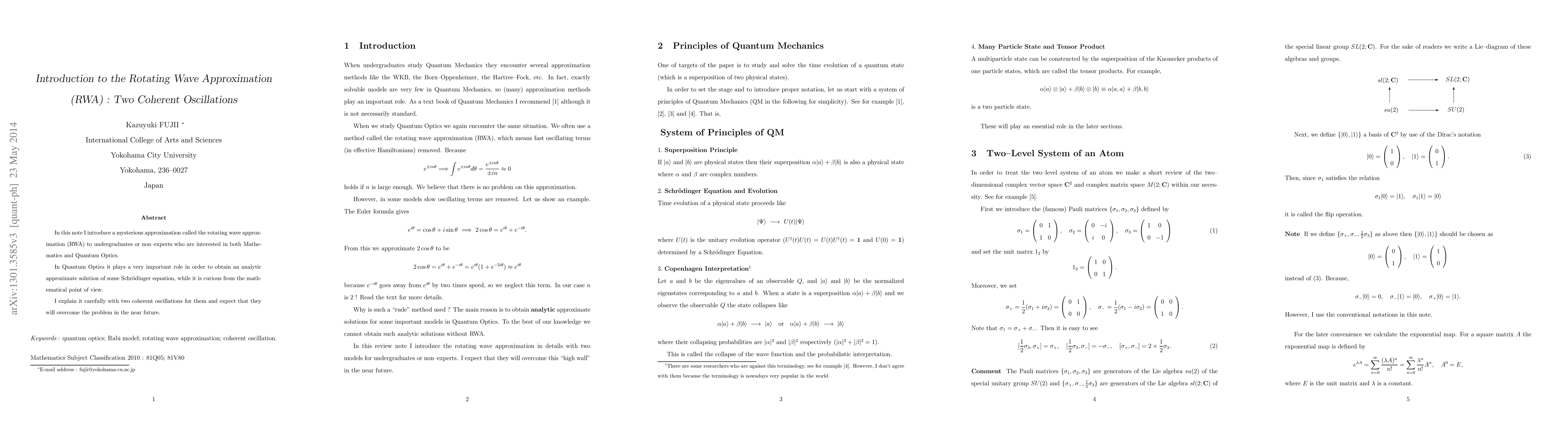 In this note I introduce a mysterious approximation called the rotating wave approximation (RWA) to undergraduates or non-experts who are interested in both Mathematics and Quantum Optics. In Quantum Optics it plays a very important role in order to obtain an analytic approximate solution of some Schr{\"o}dinger equation, while it is curious from the mathematical point of view. I explain it carefully with two coherent oscillations for them and expect that they will overcome the problem in the near future.