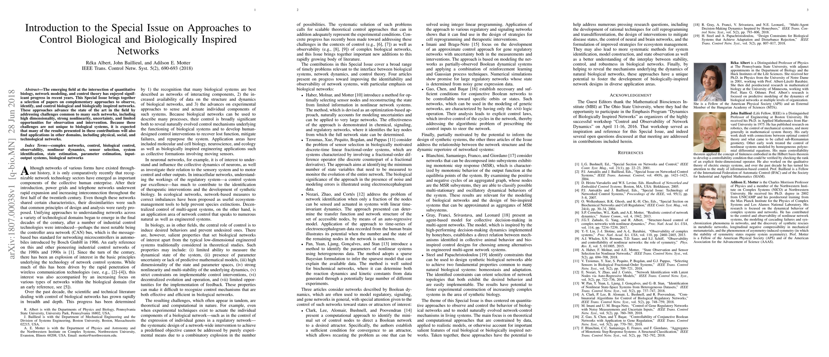 This special issue explores innovative approaches to control complex biological networks, addressing challenges like high dimensionality and strong nonlinearity. The research aims to advance the field with applications beyond biology, benefiting physical, social, and technological networks.